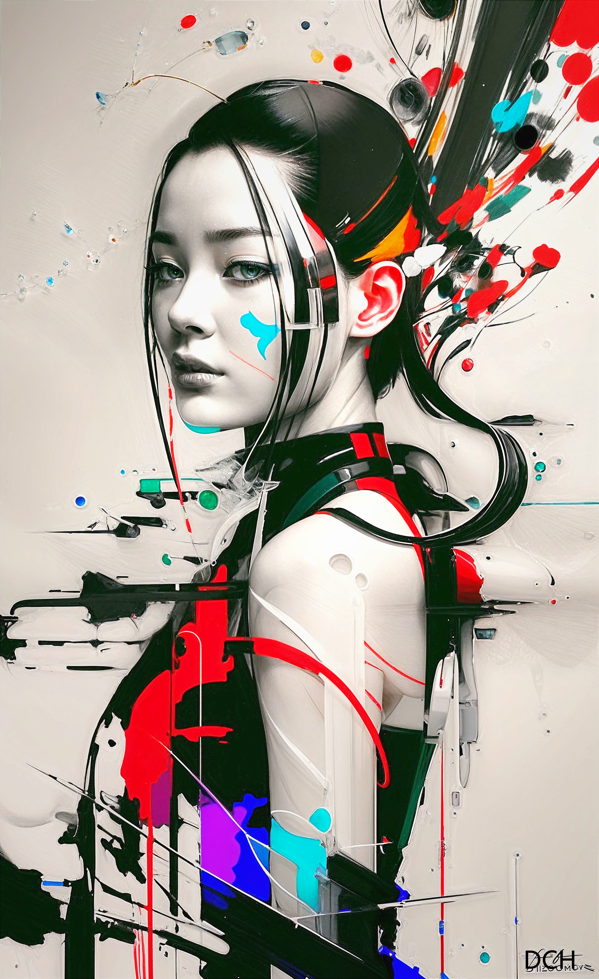 A digital artwork blending a realistic portrait of a woman with abstract, colourful paint splashes and abstract geometric shapes with subtle layering.
