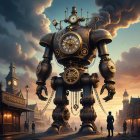 A towering steampunk robot stands in a Victorian cityscape, adorned with gears and clockwork, exhaling steam. An elegantly dressed figure observes nearby, enhancing the retro-futuristic atmosphere.