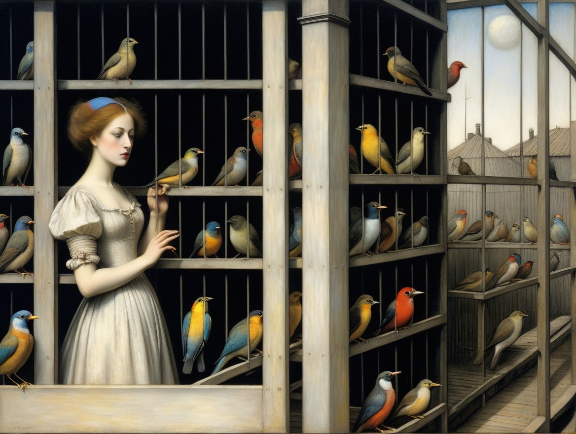 A young woman in a white dress gazes at colorful birds in a large cage, surrounded by serene architecture and a soft moonlit sky, evoking a sense of contemplation and longing.