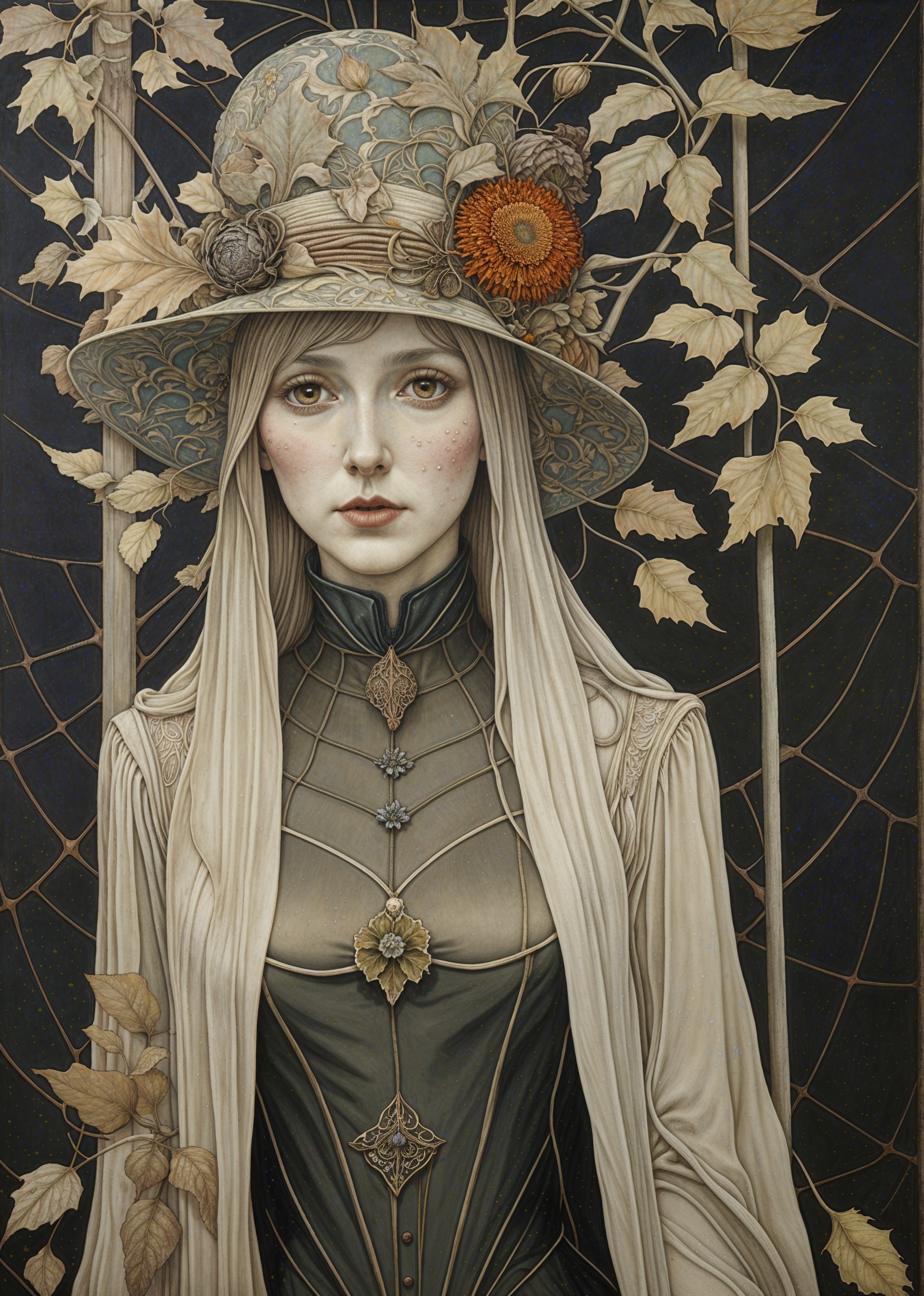The image features a woman in a detailed green dress, adorned with a wide-brimmed hat decorated with autumn leaves and flowers, set against a dark, nature-inspired background.