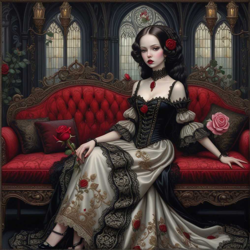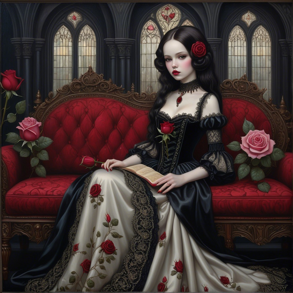A gothic figure in a black dress adorned with red roses sits amidst dark, romantic surroundings. Her pale complexion contrasts with the vibrant blooms and intricate, ornate details.