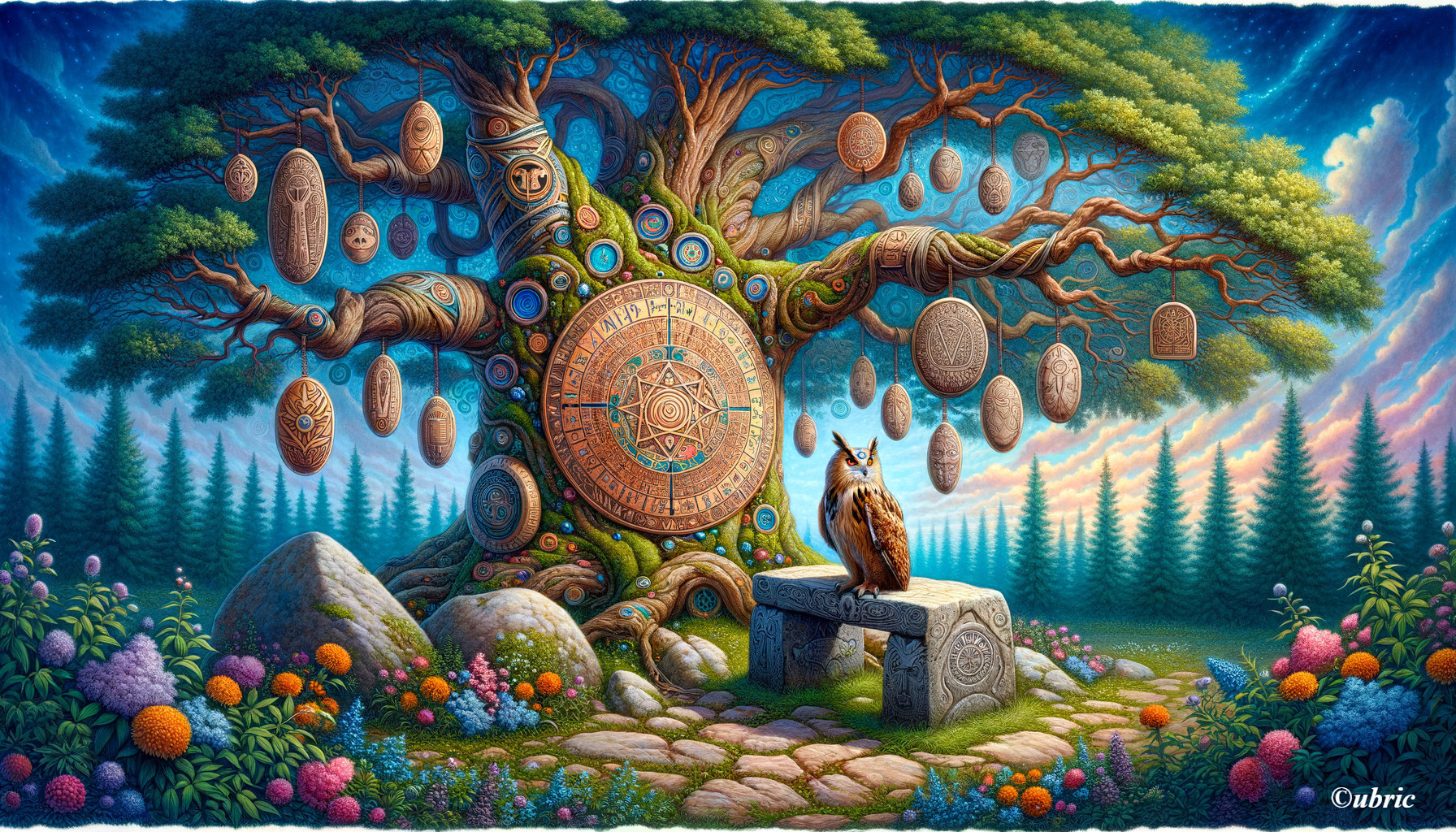 A vibrant artwork featuring a mystical tree with a clock face, surrounded by stones, a wise owl, and a lush forest under a blue sky.