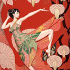 A graceful figure dances amidst vibrant tropical flowers and butterflies. Her flowing gown features soft shades, complementing the rich red background. The scene exudes elegance and nature's beauty.