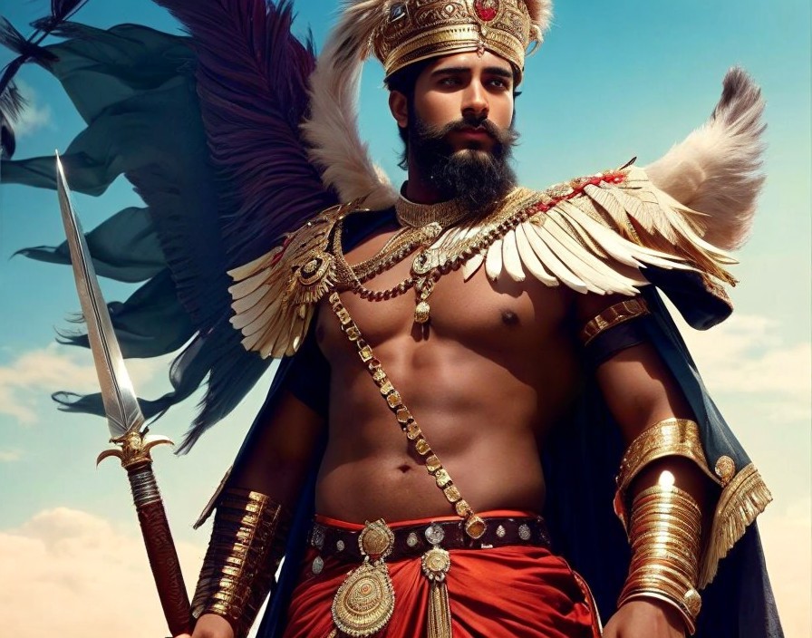 A regal figure clad in ornate armor and a crown, stands proudly with a sword, accompanied by two horses under a sunny sky.