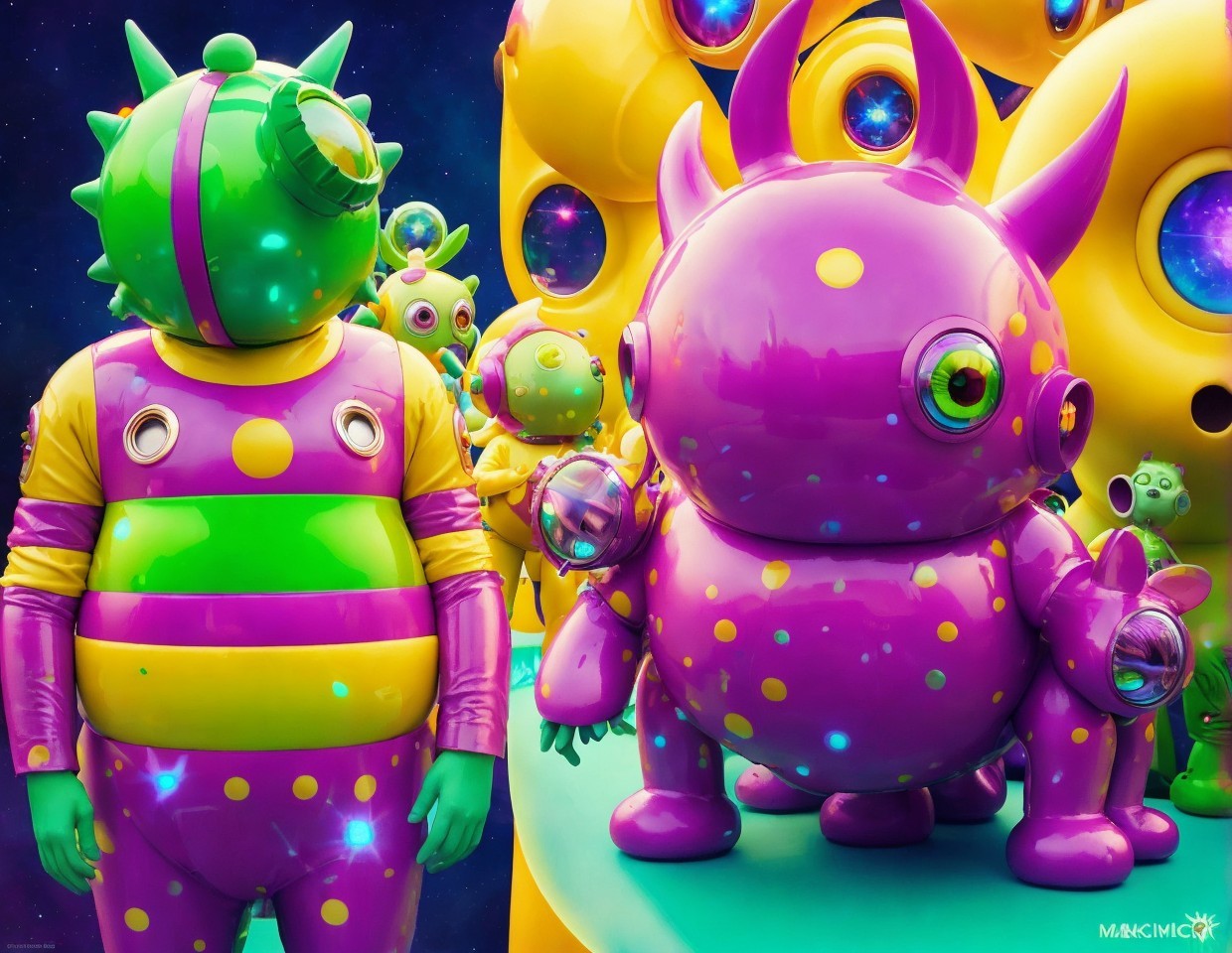 Colorful alien figures with one-eyed, multiple-eyed characters in bright purple and green, against a space-themed backdrop with bubbles.