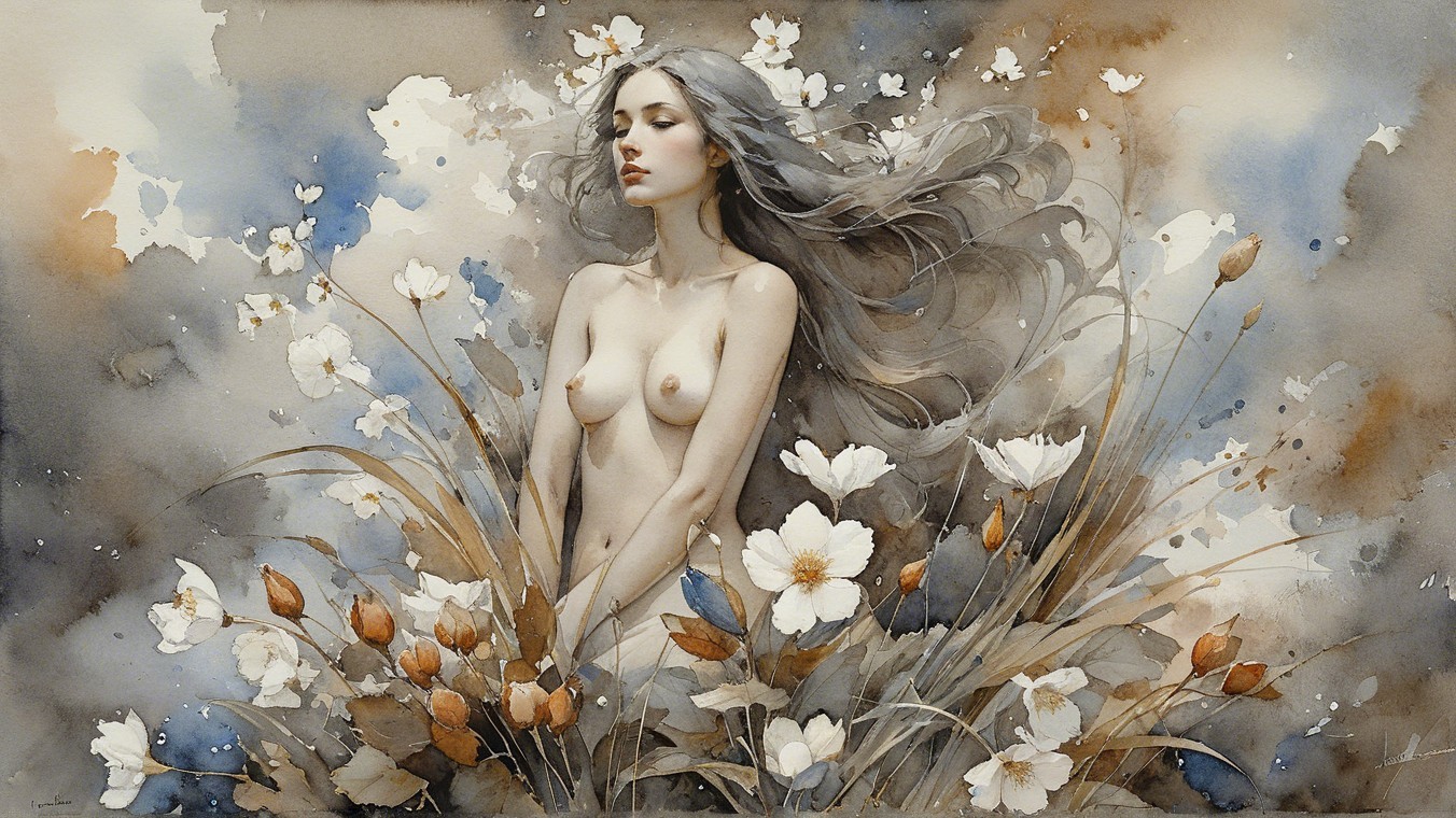 A serene scene features a young woman sitting on rocky shores, wearing a light bikini top and draped fabric. Waves lap gently at the rocks, under a cloudy sky, evoking calm and introspection.