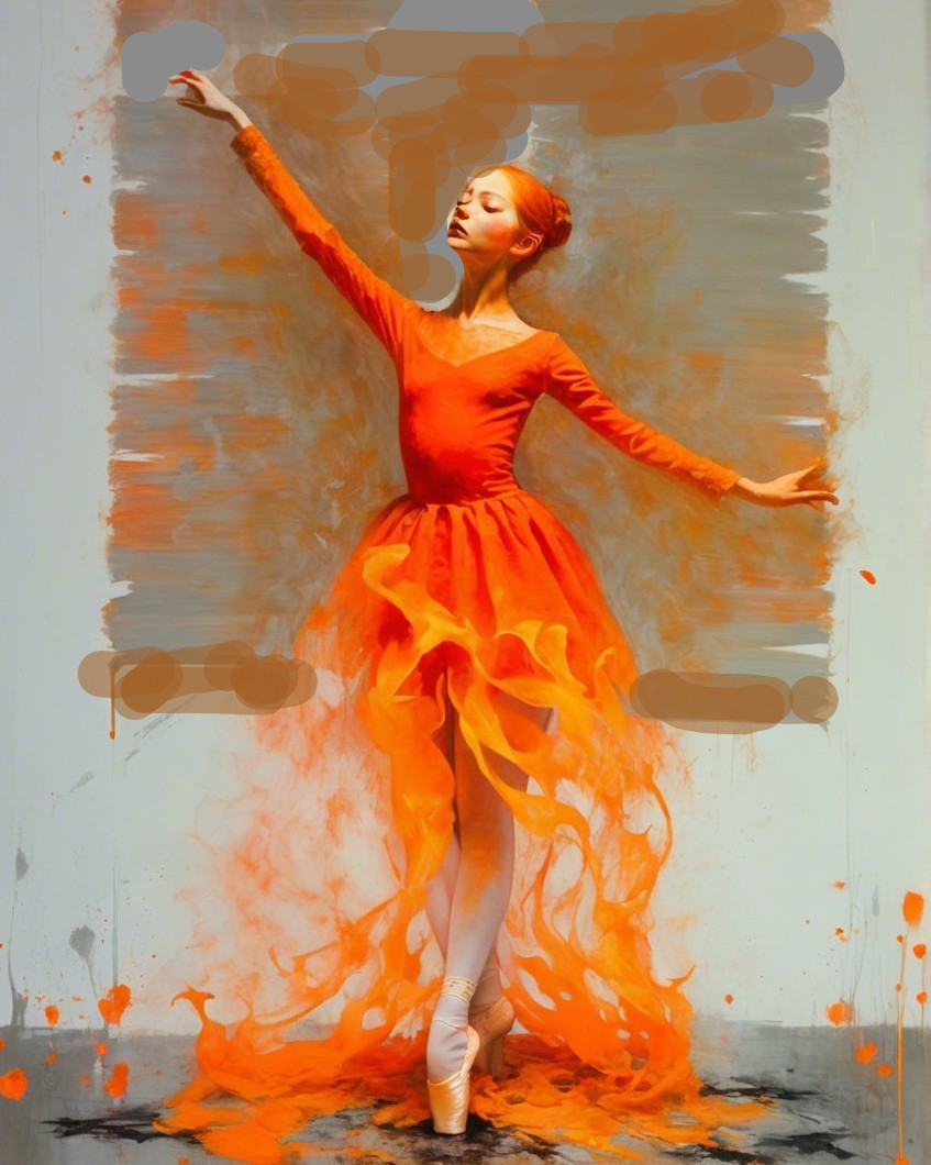 + Prompt:young dancer in the shape of orange flame; Speedpaint with large brush strokes paint splatter; paint drips; drip painting; by Brian Kesinger, Victo Ngai, Jeffrey Catherine Jones, RHADS, Wadim Kashin; a masterpiece; maximalist; uncanny; highly detailed and intricate, beautiful colors