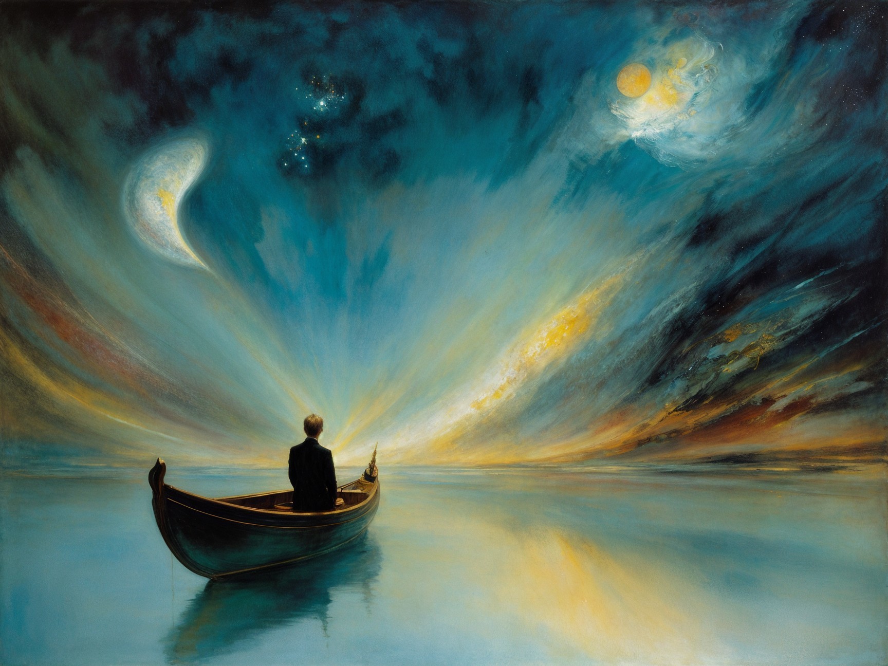 A solitary figure sits in a small boat, illuminated by a glowing light. The surreal sky features swirling galaxies, planets, and moons, reflecting a tranquil, ethereal atmosphere on calm waters.