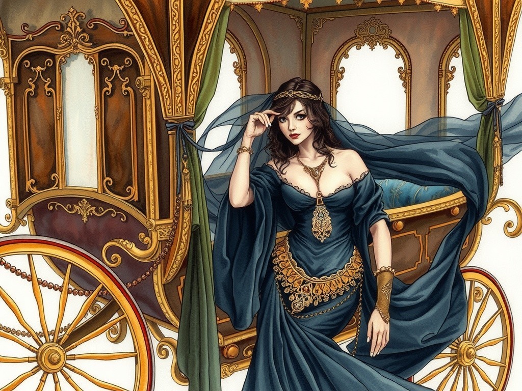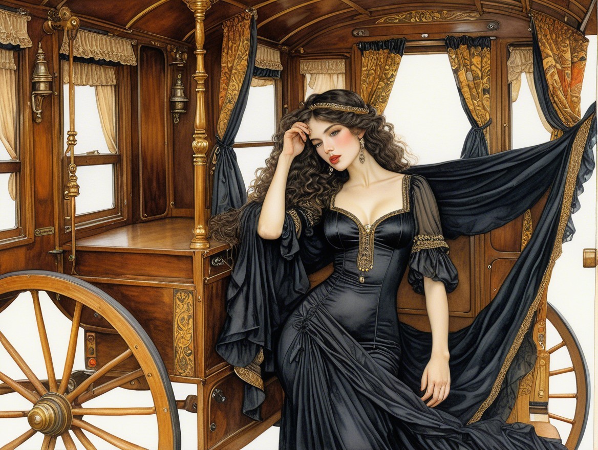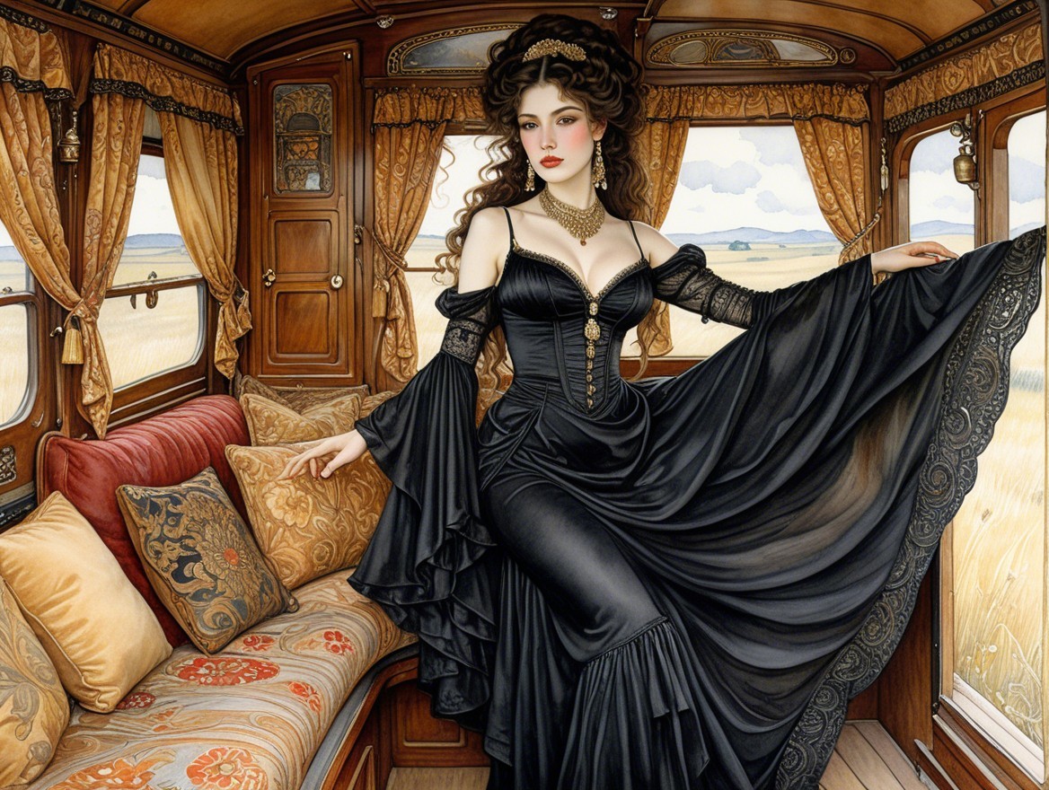 A woman in a stunning black gown stands elegantly in a vintage train carriage. Rich embellishments and warm colors create a luxurious atmosphere against a scenic backdrop.