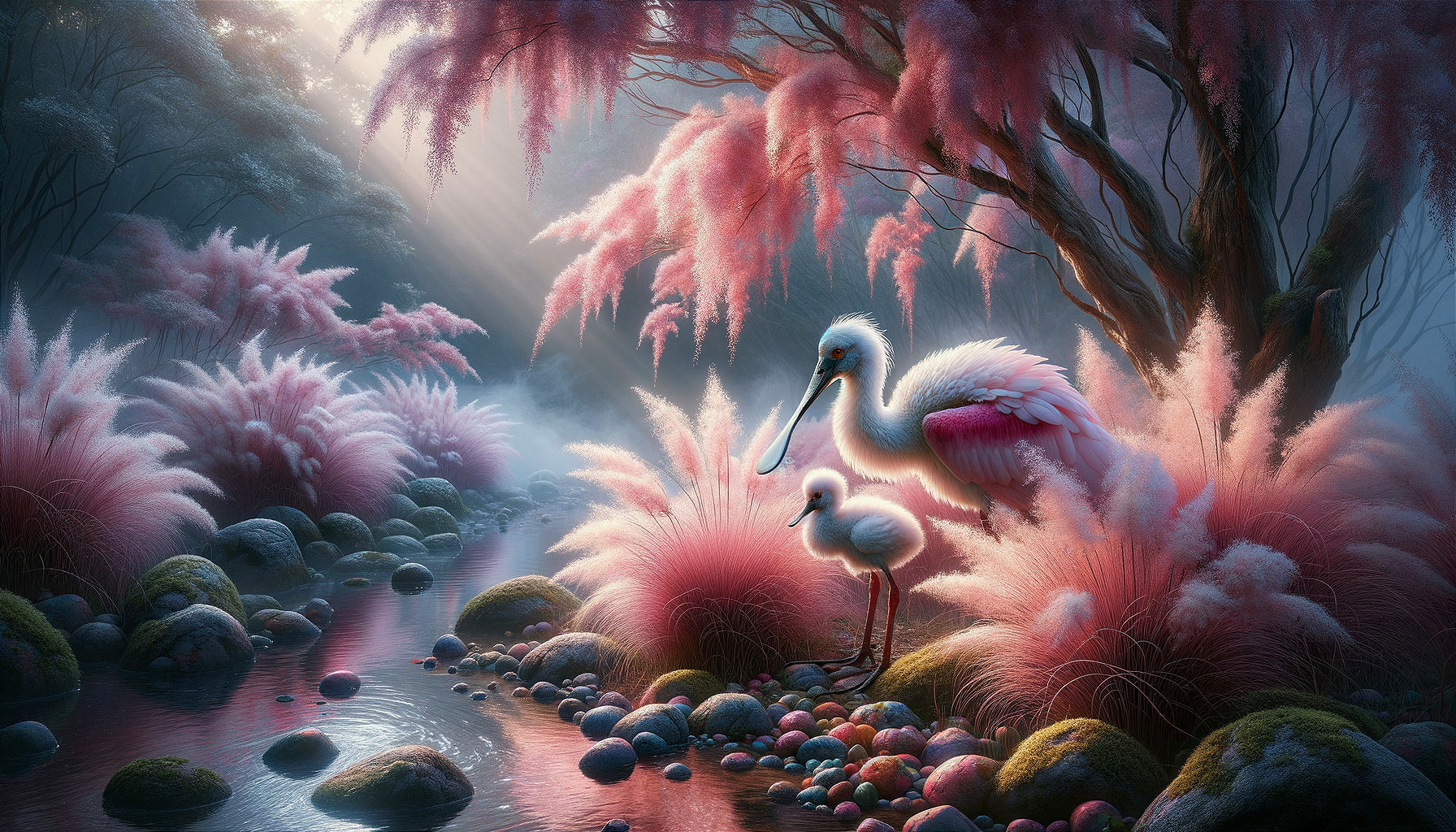 A stunning digital painting depicting a mother roseate spoonbill and her babies nestled in pink muhly grass near a spring river. The artwork exudes a delicate and graceful style with soft, silvered tones, colorful stones, morning dew, and a touch of mist, creating a high fantasy scene with dramatic lighting and ultra-realistic details.