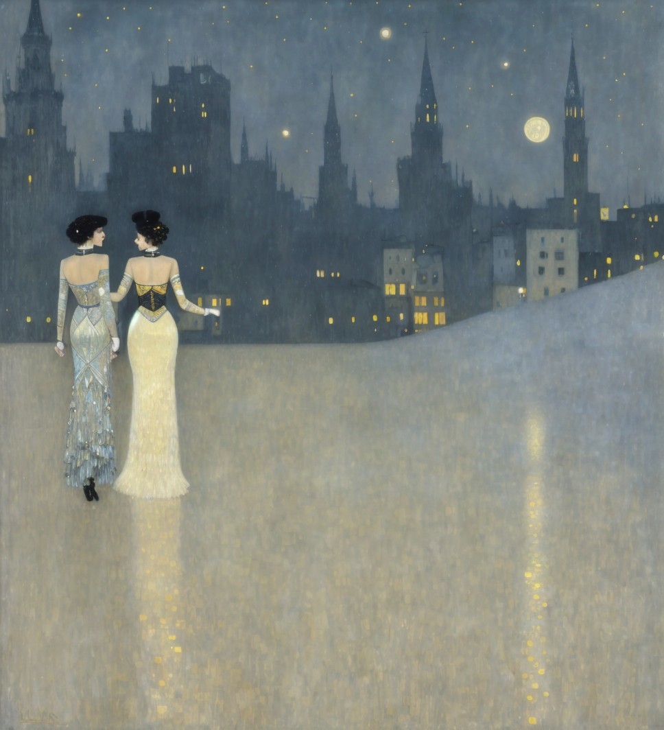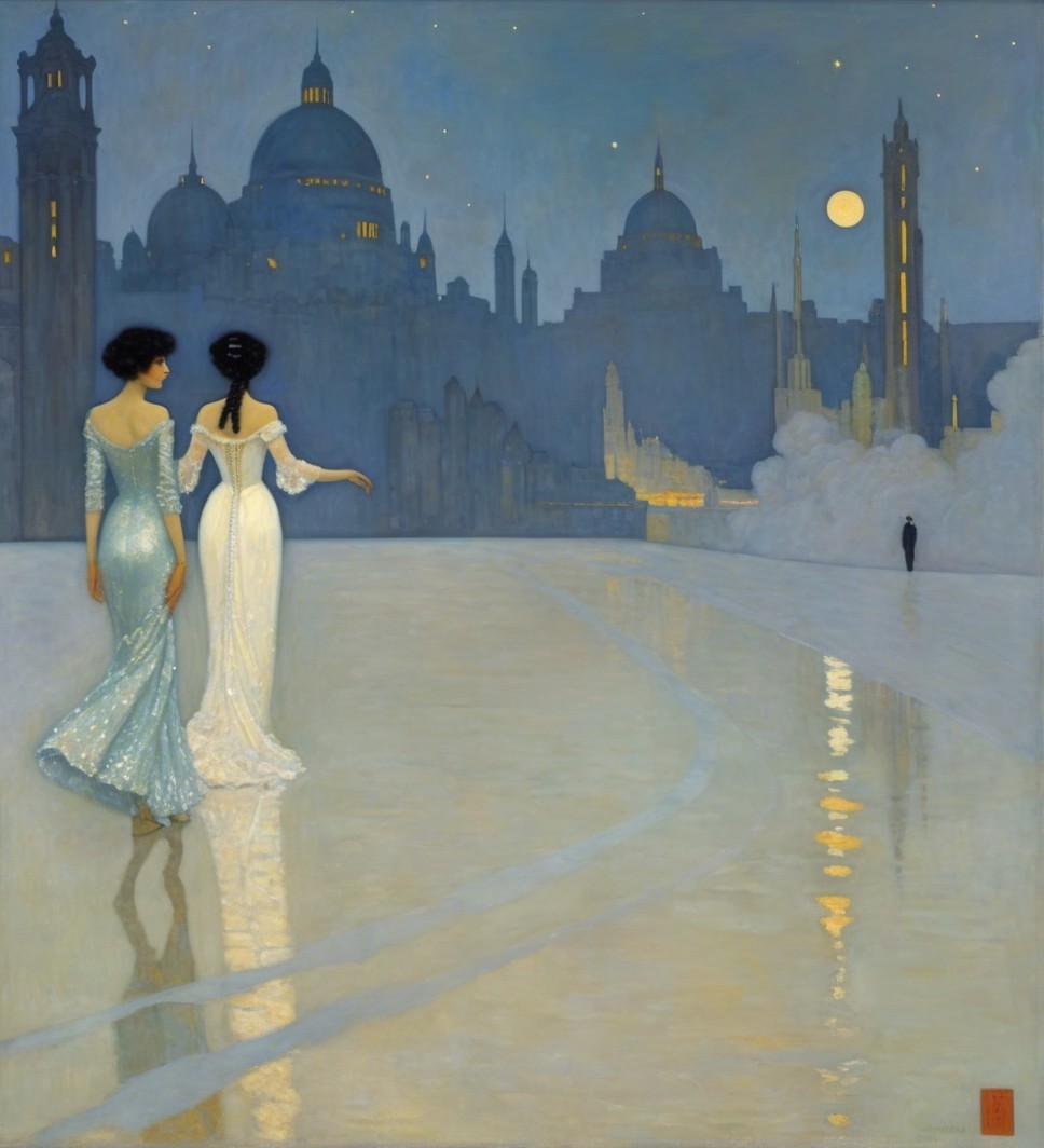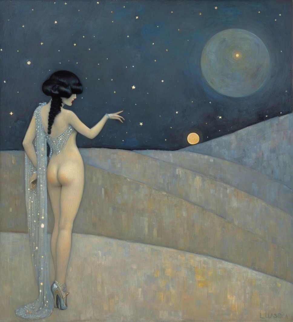 A mystical woman in elegant attire stands before a shimmering cityscape under a starry night sky, adorned with golden elements and a large, glowing moon, evoking a sense of wonder and tranquility.