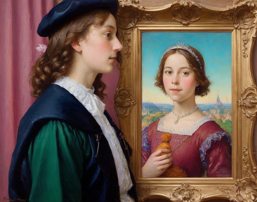 Classic painting of young woman in blue beret beside framed portrait of another woman in purple dress