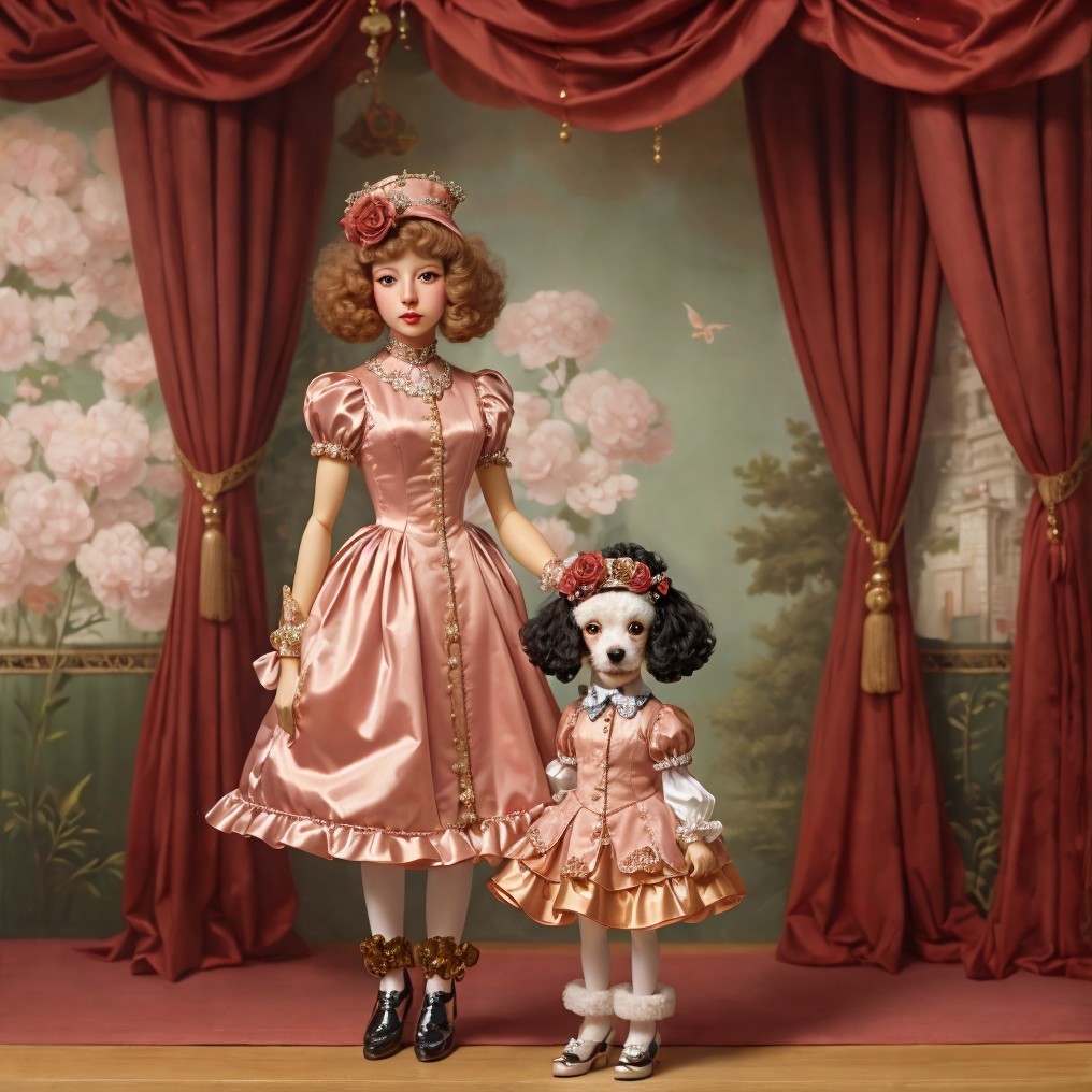 A vintage-style portrait of a woman and a poodle in matching elegant pink dresses against a theatrical backdrop.