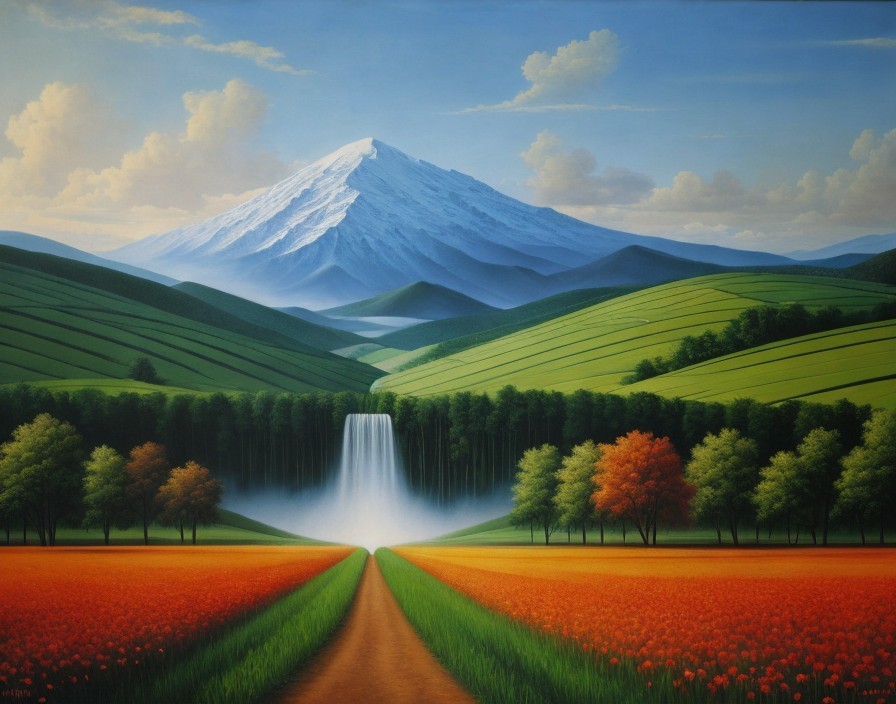 A couple walks down a path through vibrant flower fields towards majestic mountains with waterfalls and misty forests.
