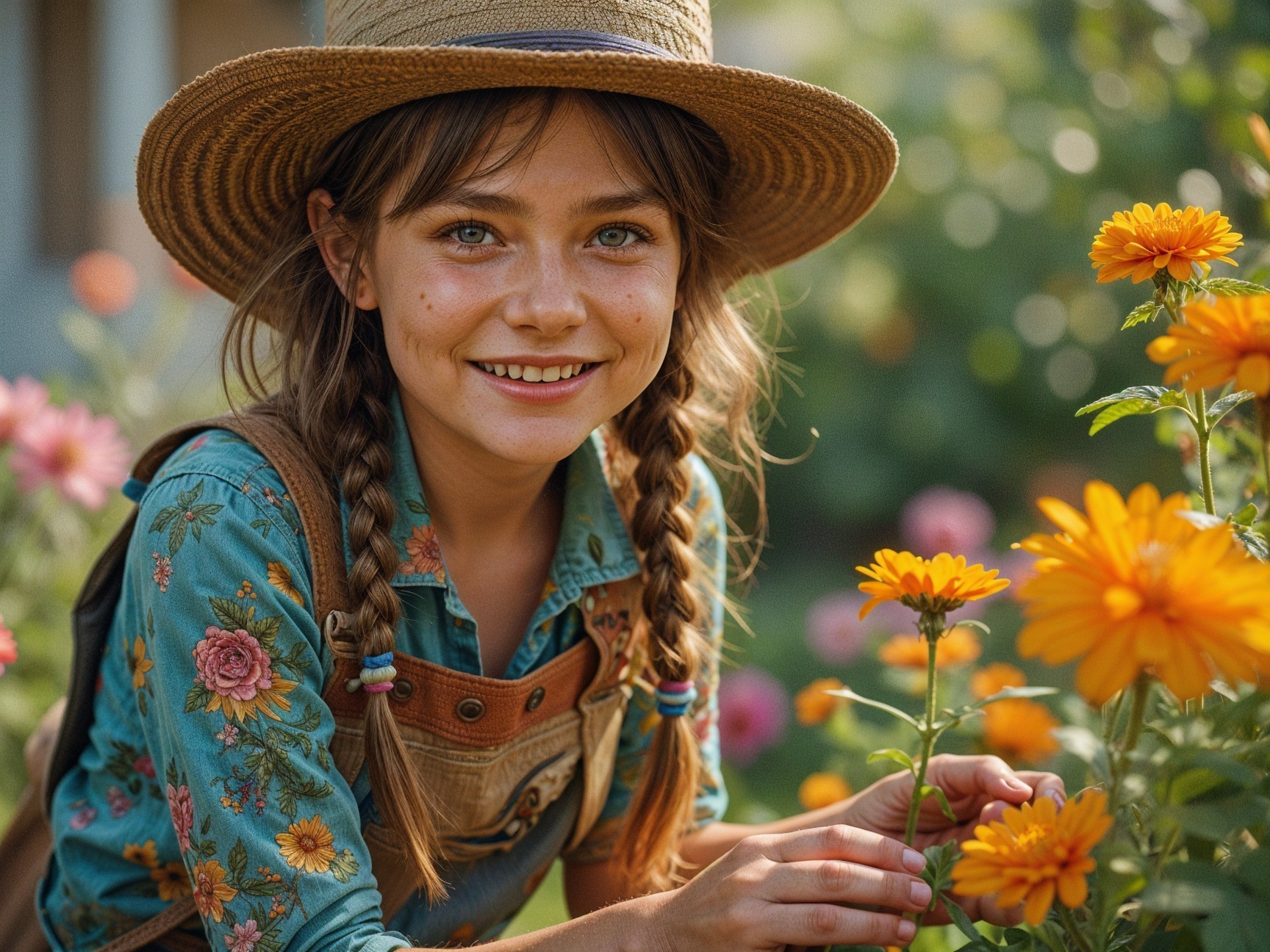 A young girl with long hair, wearing a straw hat and denim overalls, smiles warmly while kneeling among vibrant flowers in a lush garden, showcasing her love for nature and gardening.