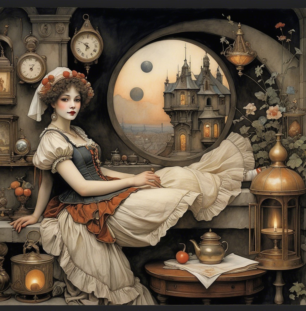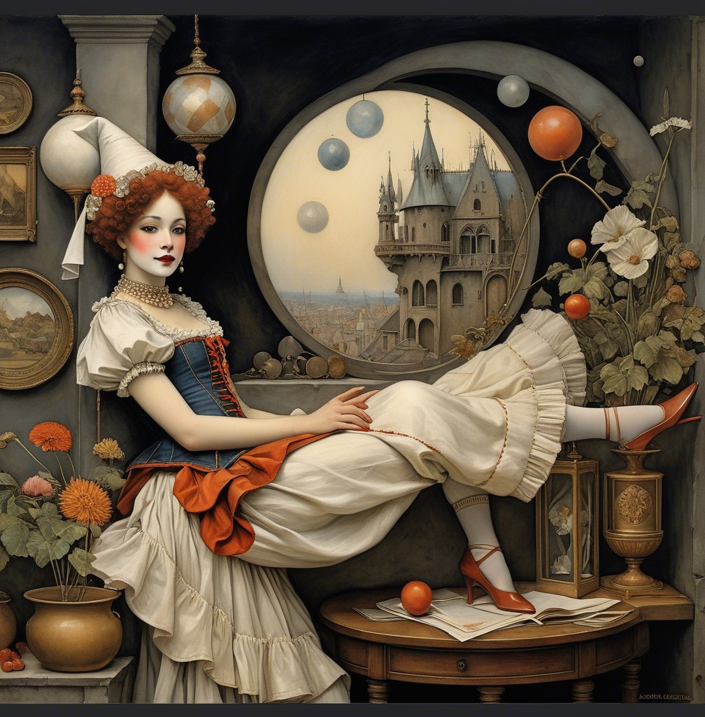 A whimsical figure portrays a clown with striking makeup, fluffy hair, and an elaborate costume. Surrounded by colorful spheres, she gazes thoughtfully, blending elegance with playful surrealism.