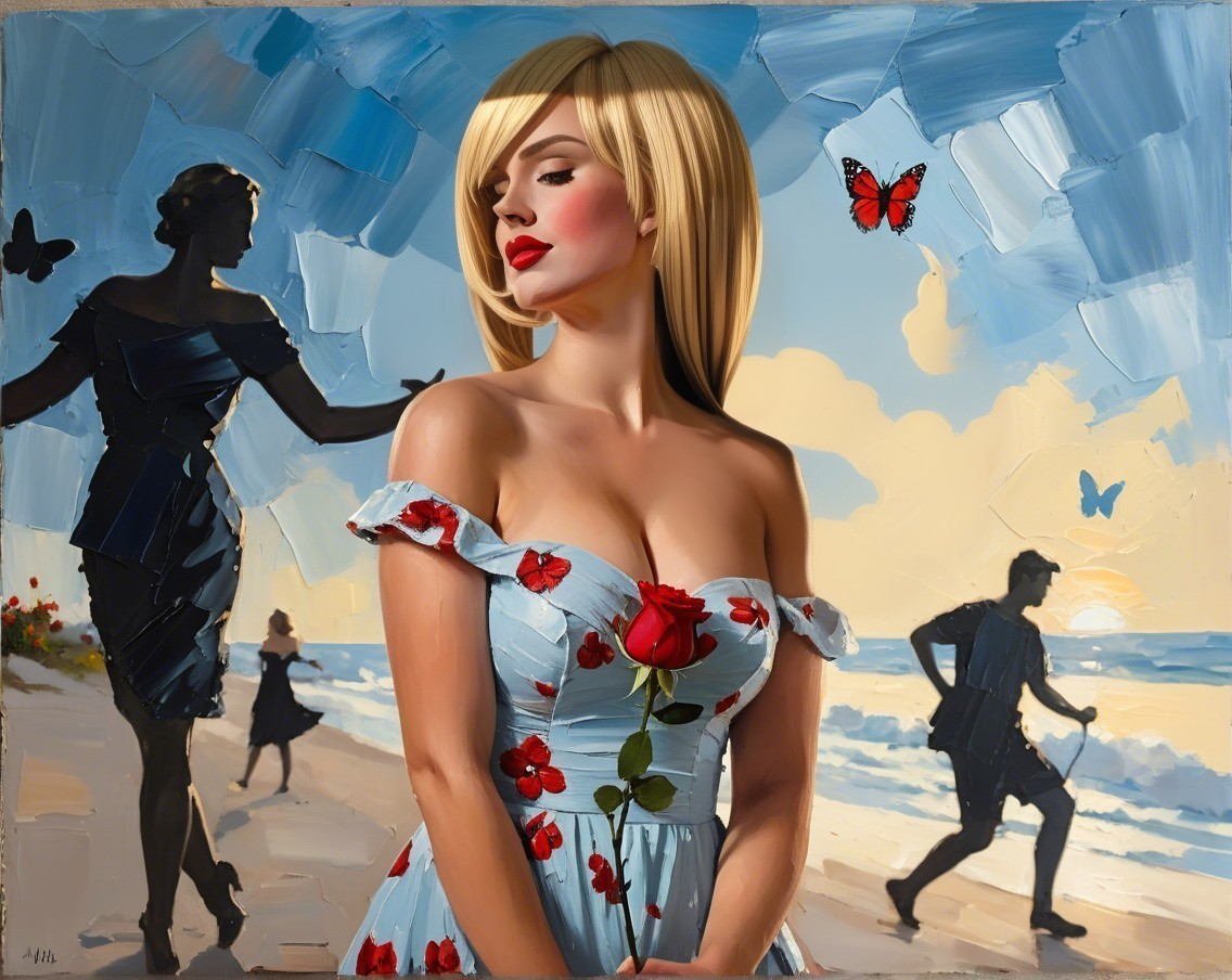A woman in a floral blue dress holds a rose by the beach, with a dreamy sunset background. Silhouettes of another woman and a couple with butterflies add a whimsical touch.