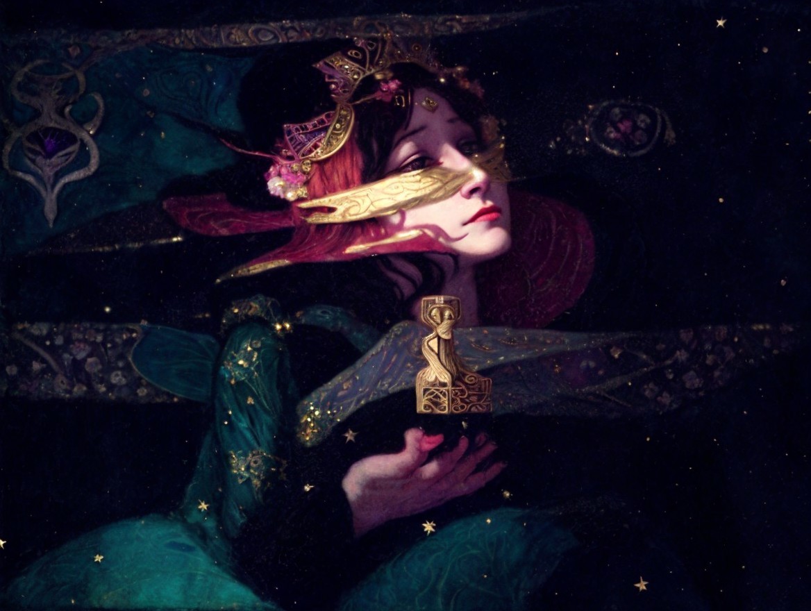 Illustration of a crowned figure in a teal dress, adorned with gold and floral accents, submerged in a dark, starry expanse.