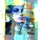 The artwork features a woman with striking blue and gold hues, her face partially obscured by abstract shapes and floral motifs, creating a captivating blend of color and texture.