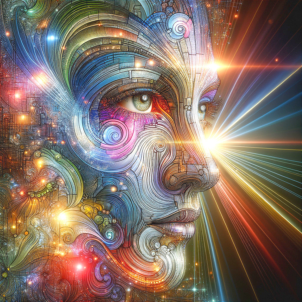 Vibrant digital artwork featuring a stylized, metallic face with intricate patterns and a beaming light from the side.