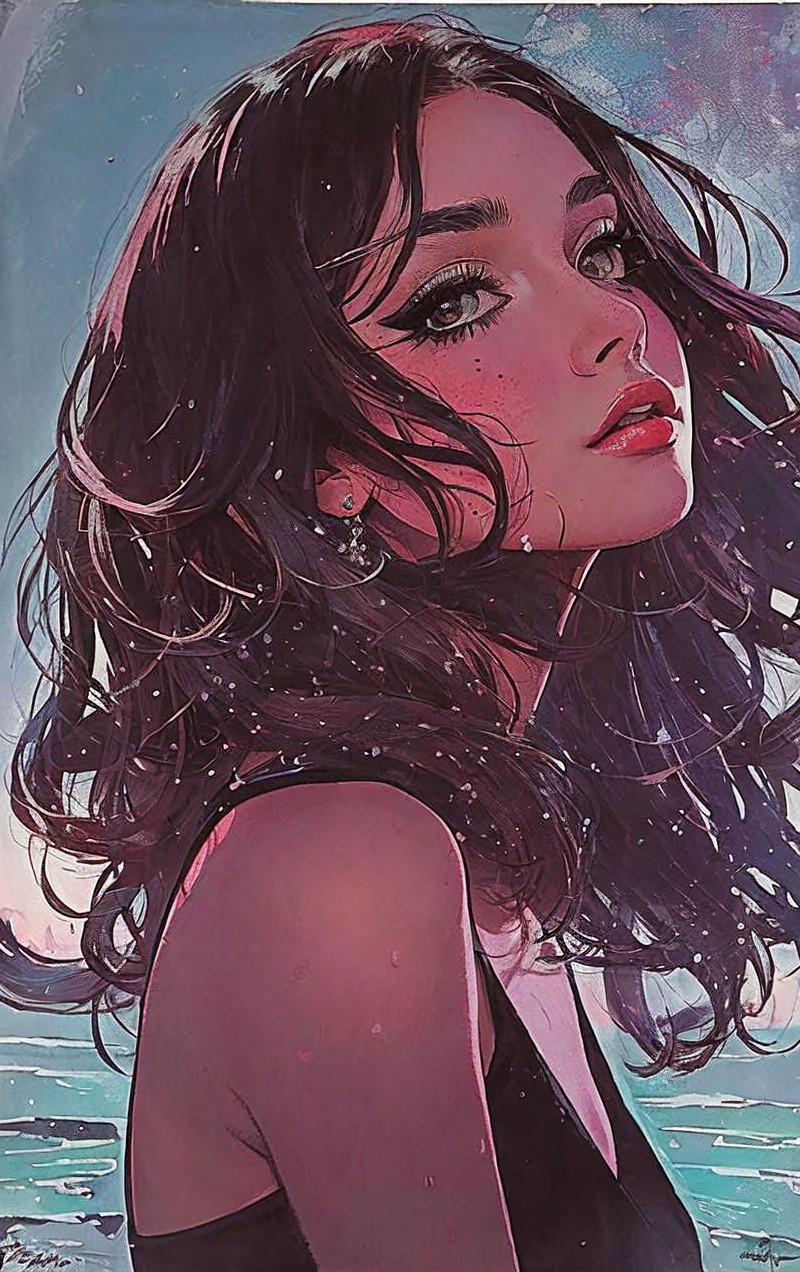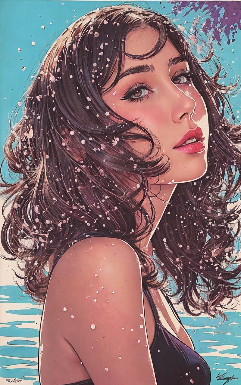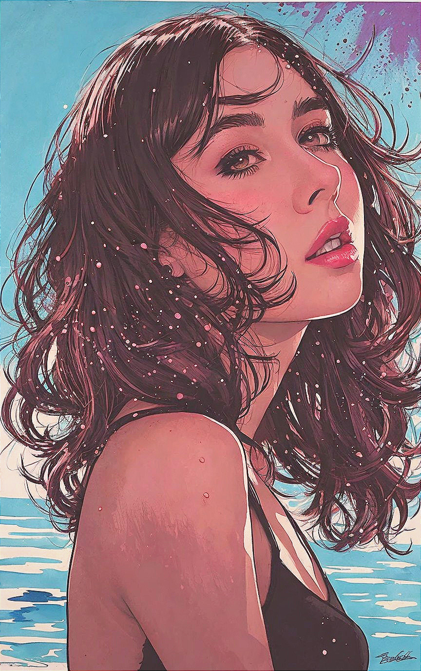Portraiture of teenage temptress drawn with ink and ballpen, splashing, blotting quill pen, style of Overton Loyd merged with70ies adult european comic art style, ballsy strokes, fine encoustic streaks, squiggly lines, evocative. colored with softened aquarelle, grain, overspray of color, stylized comic book art by barbara canepa, Hues, brightness 1.9, layered, Figurative, back-lit, delicate coloring, abstract, intricate, epic, fuzzy, twirl, gorgeous, beautiful composition, synthetic, heretic, sumptuous, intricate fine lineage, filigrane texture of fine lines, quilling, quaint, folded paper style, cel-shaded, golden ratio, high coloring, brushed textures 1.7, 3d effects 1.8, ambient occlusion 1.5, anisotropic filtering 1.7, raytraced shadows 1.8, sublime, brightness 1.4, tetradic color scheme purple pink lilac amber, stacked-up perspective 1.9, comical sketch art, geometrical features, octane render illustration, dreamscape, beautiful composition 1.9