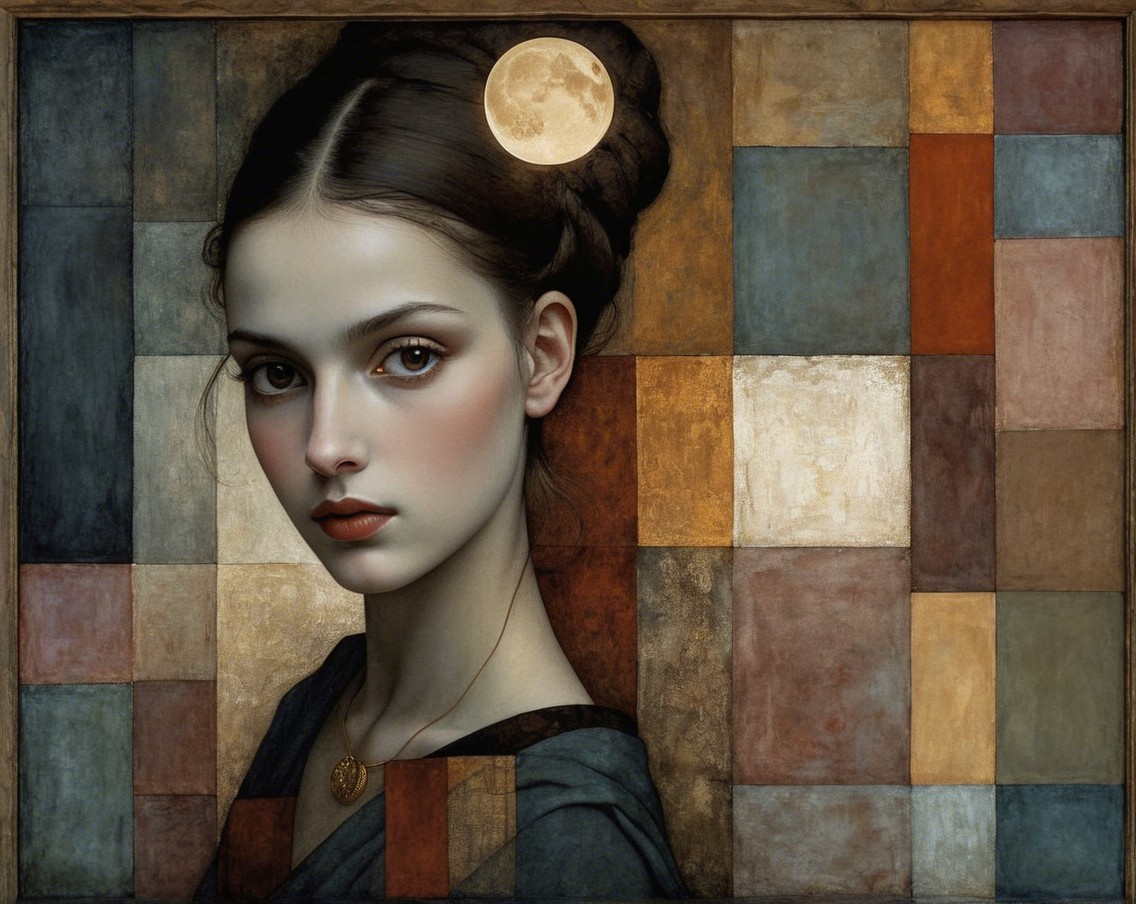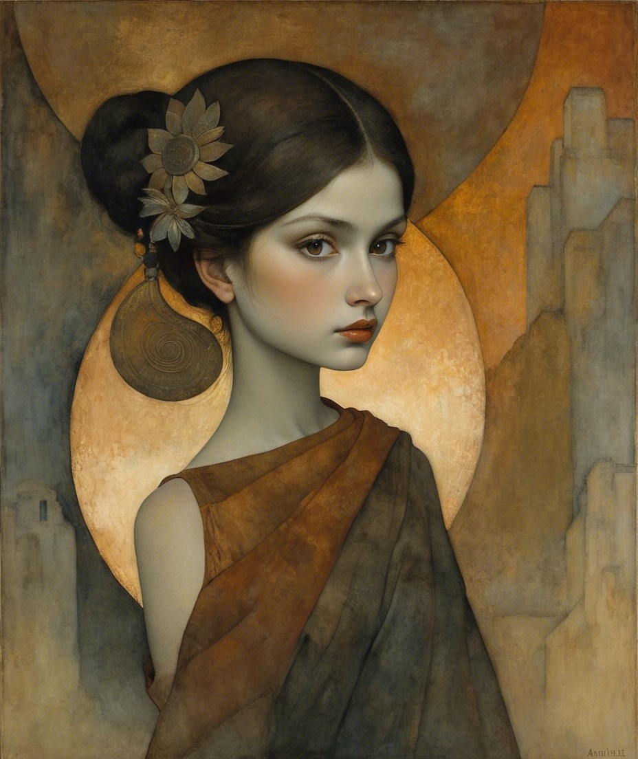 The image portrays a serene woman with golden hair and an ornate headpiece, cradling a cat against her shoulder, with a soft, ethereal background that enhances her calm expression.