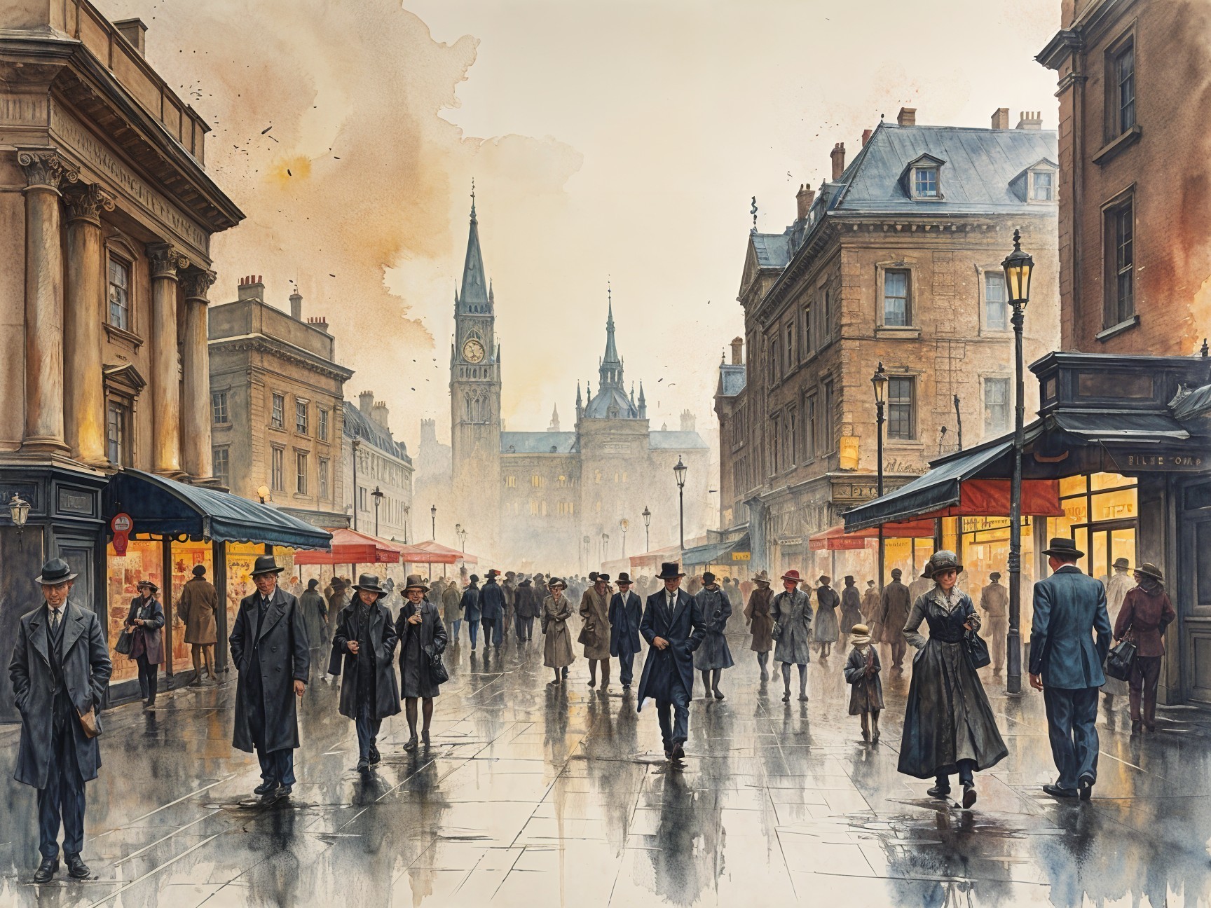 A bustling street scene in a vintage city, with people in period attire walking on a wet pavement reflecting buildings and a clock tower. Warm hues illuminate the cloudy sky at dusk.