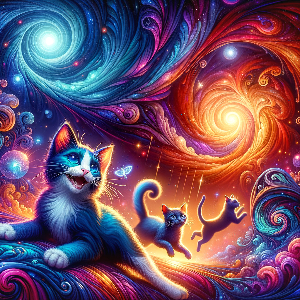The image features three playful cats exploring a vibrant cosmic landscape, filled with swirling galaxies, sparkling stars, and colorful nebulae, creating a whimsical and magical atmosphere.