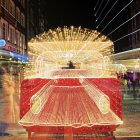 A nighttime scene in a city with a red double-decker bus, a woman, and buildings, all outlined in neon lights. The bus is decorated with numerous small red lights and its windows are illuminated with bright blue lights, creating a star-like effect; a snowflake pattern in blue light adorn