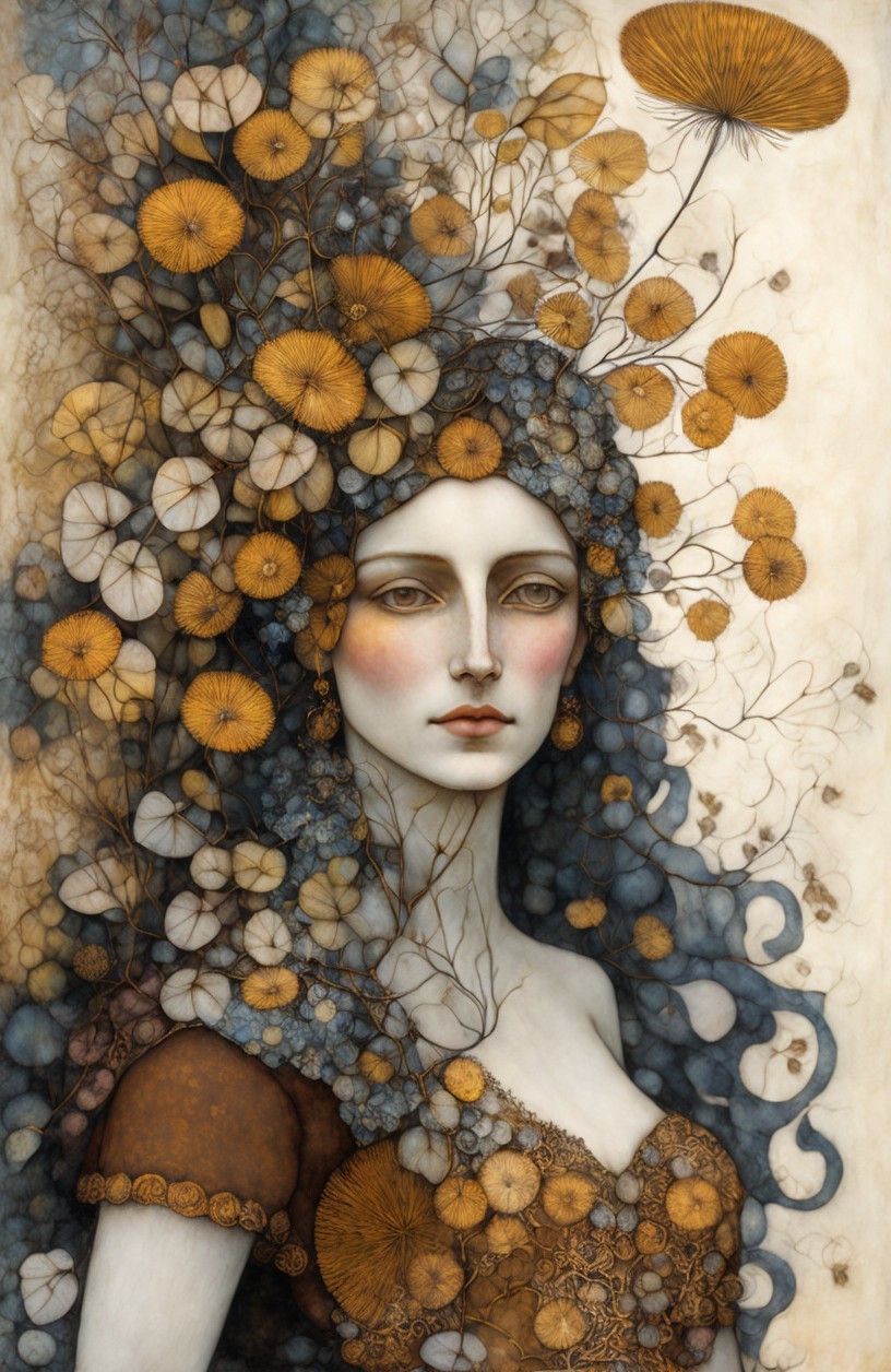 Beautiful woman with a dandelion hat, portrait in ochre, patina of ancient stone with moss, art brut, moody, somber, desaturated colors, in the style of Paul Klee, Arthur Rackham