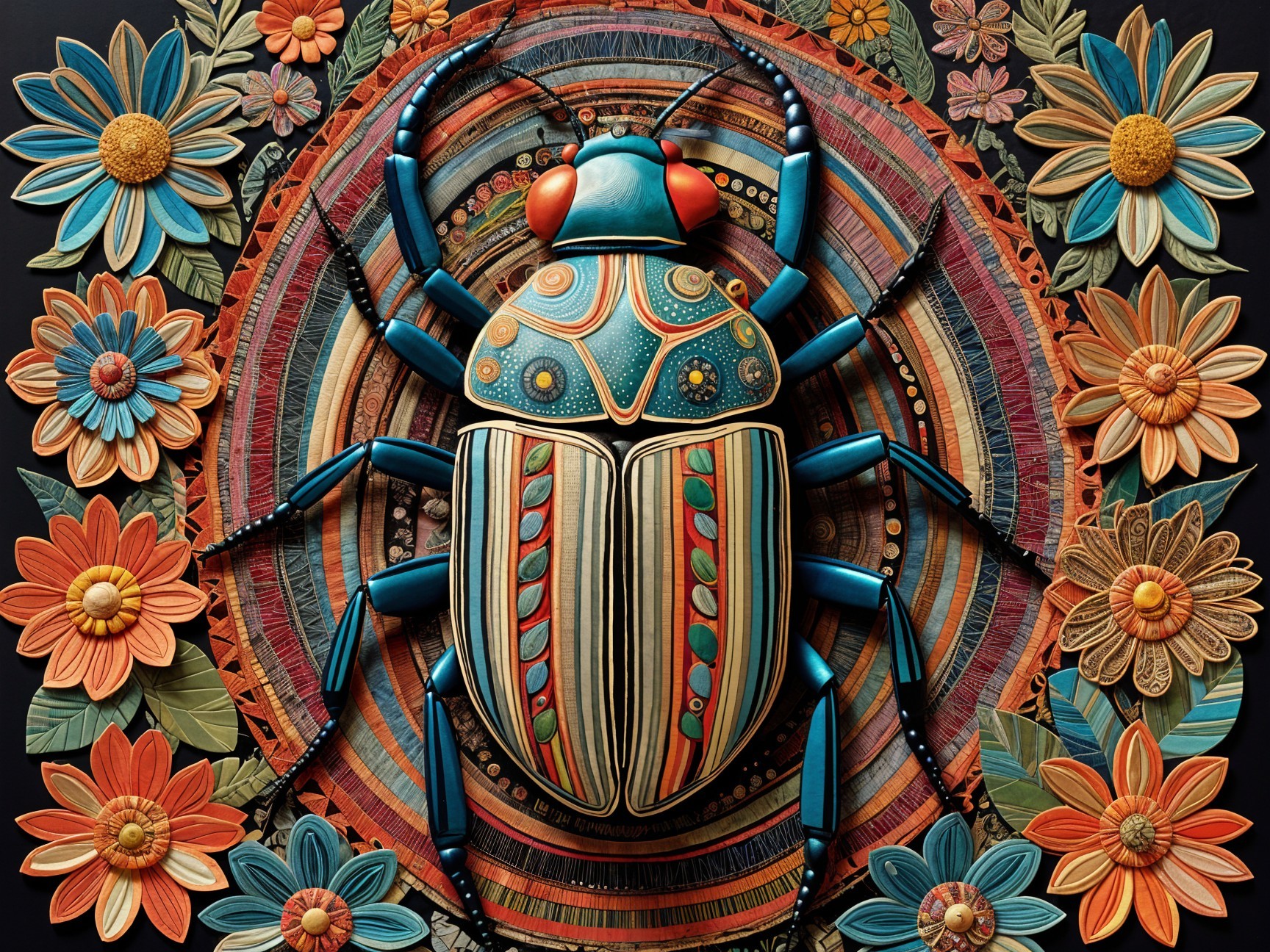 A vibrant, stylized beetle takes center stage, adorned with intricate patterns and bright colors. Surrounding it are beautifully crafted flowers, creating a striking, textured backdrop.