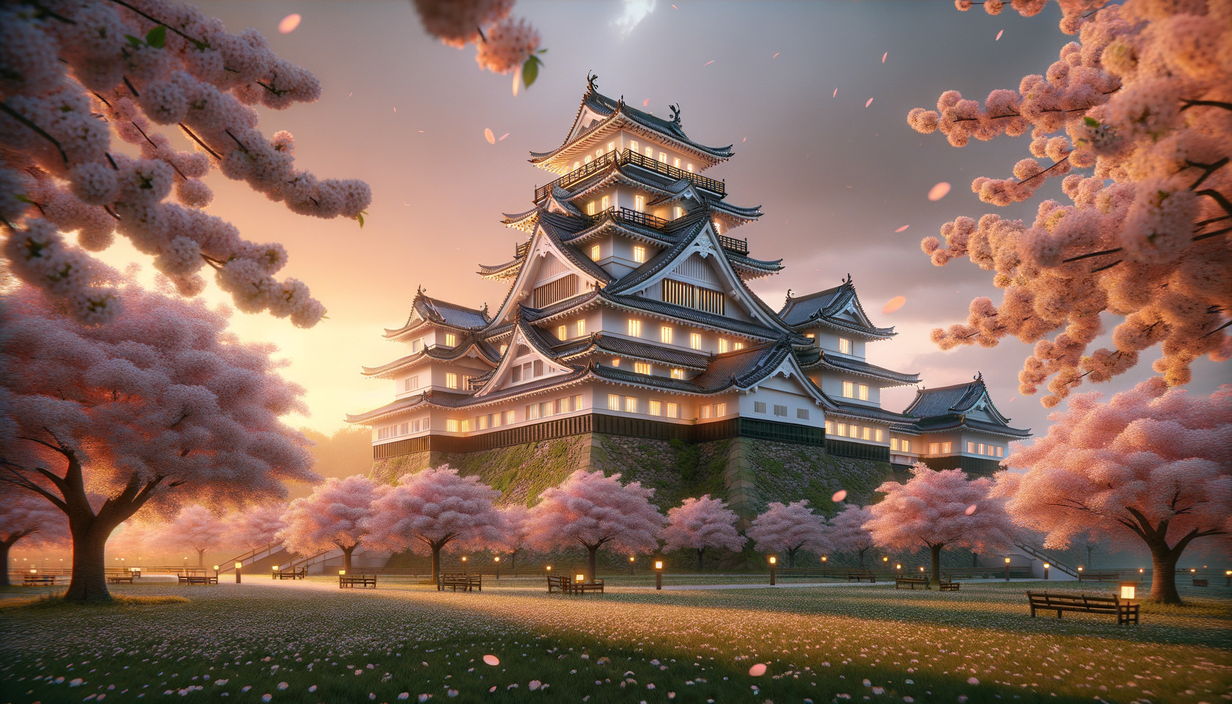 A traditional Japanese castle amidst blossoming cherry trees with a vibrant sunset in the background.