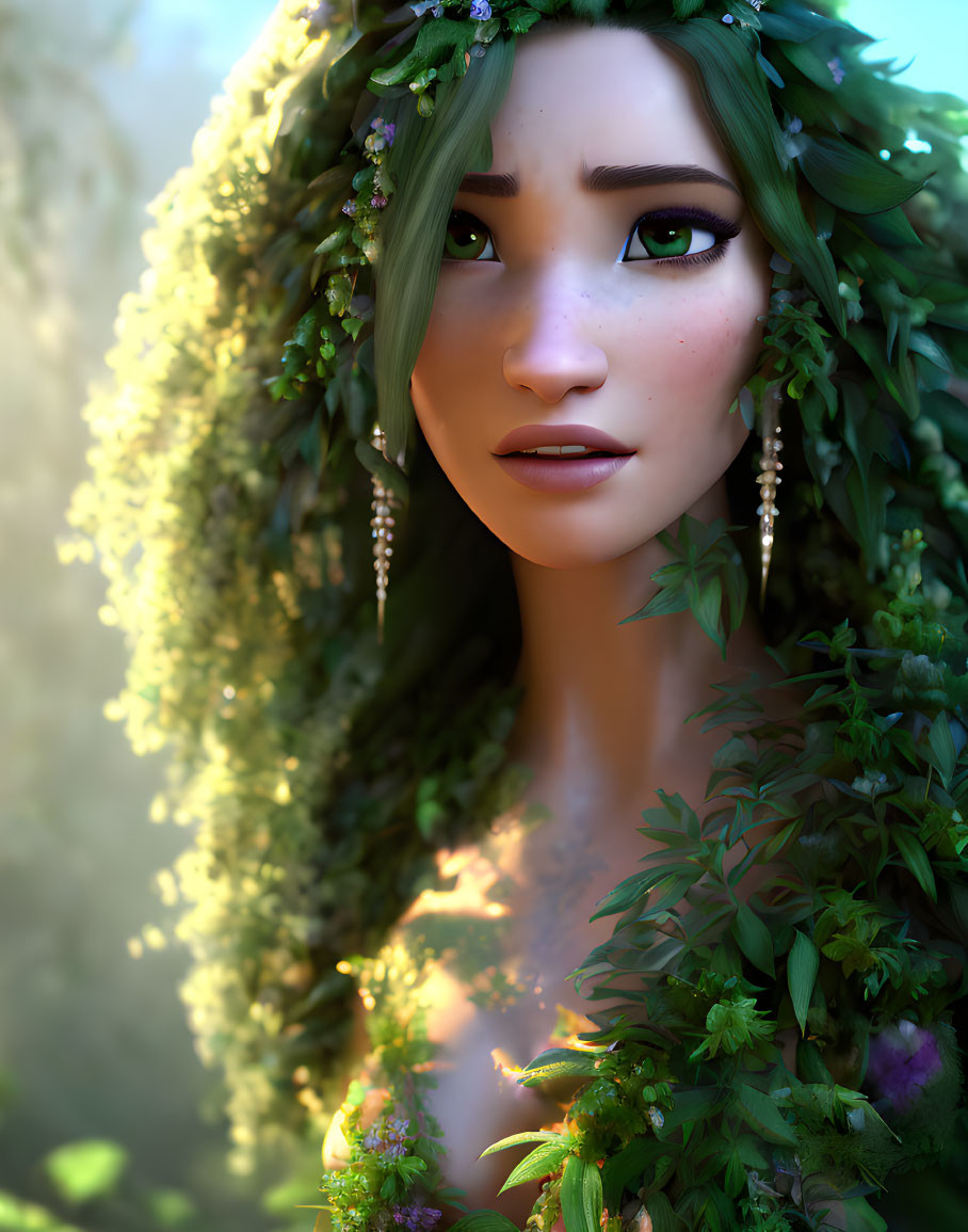 A serene figure with long, curly green hair adorned with leaves stands amidst a sunlit forest. She wears an elegant green dress and golden earrings, embodying a nature-inspired goddess.