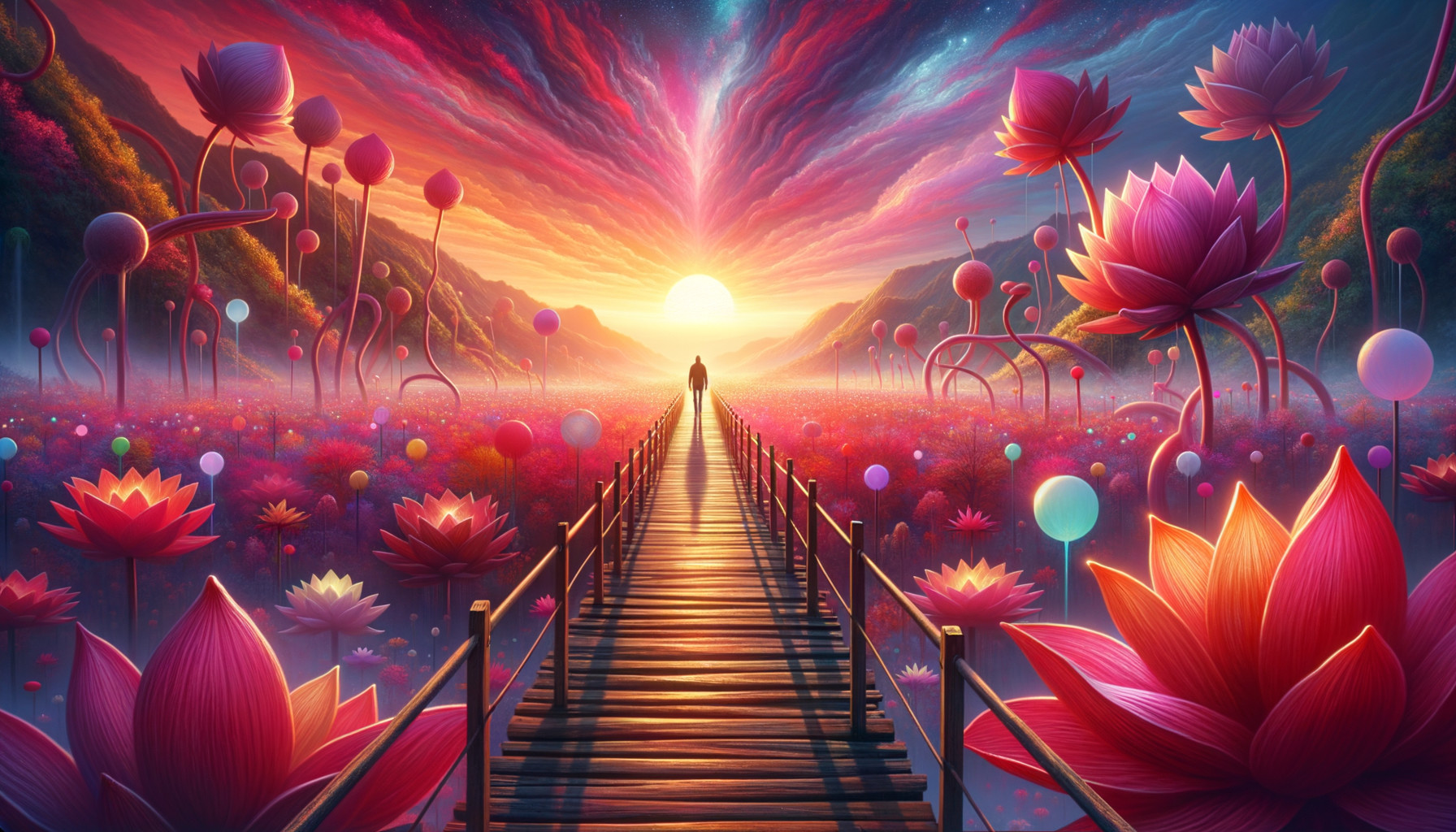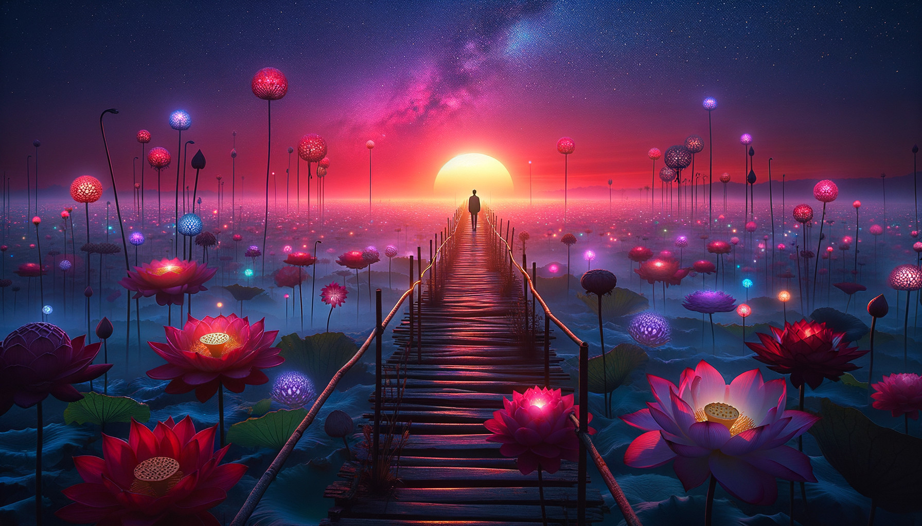 Wooden Pier Surrounded by Colorful Lotus Flowers at Twilight