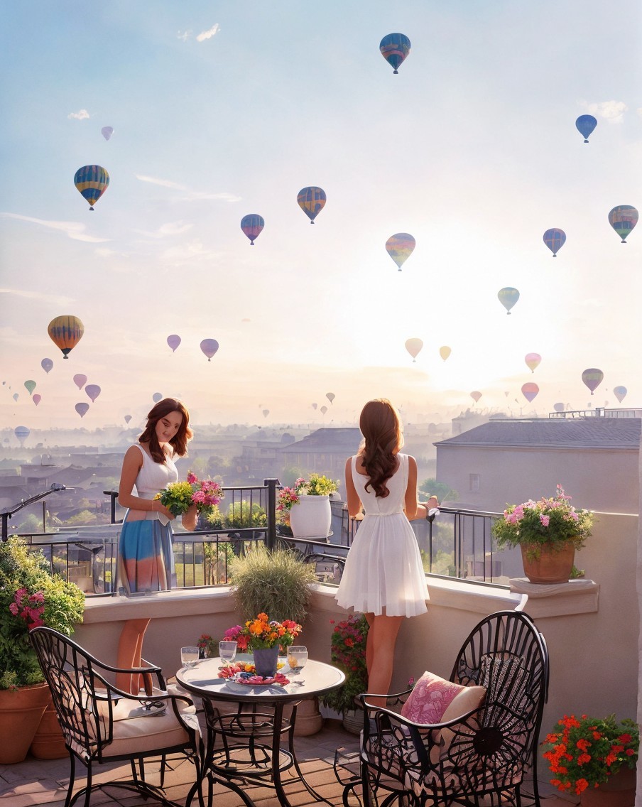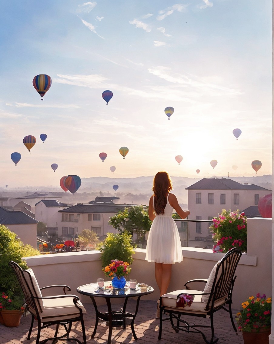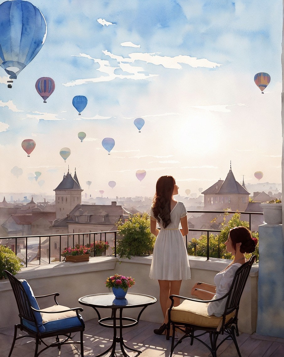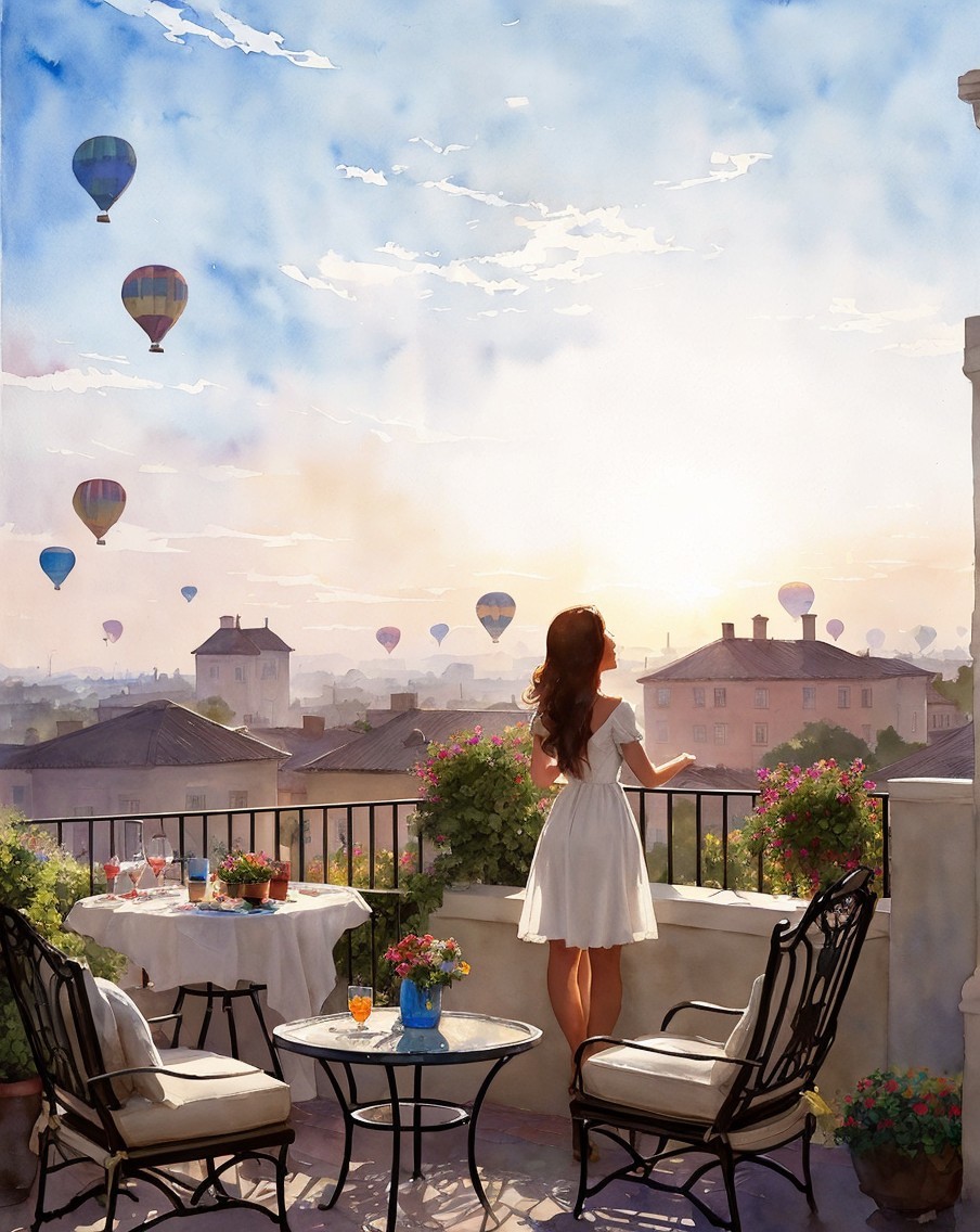 + Prompt:Silhouette of beautiful woman watching multicolored hot air balloons take off from a gorgeous patio, sun beams, Watercolor Thomas by Wells Schaller