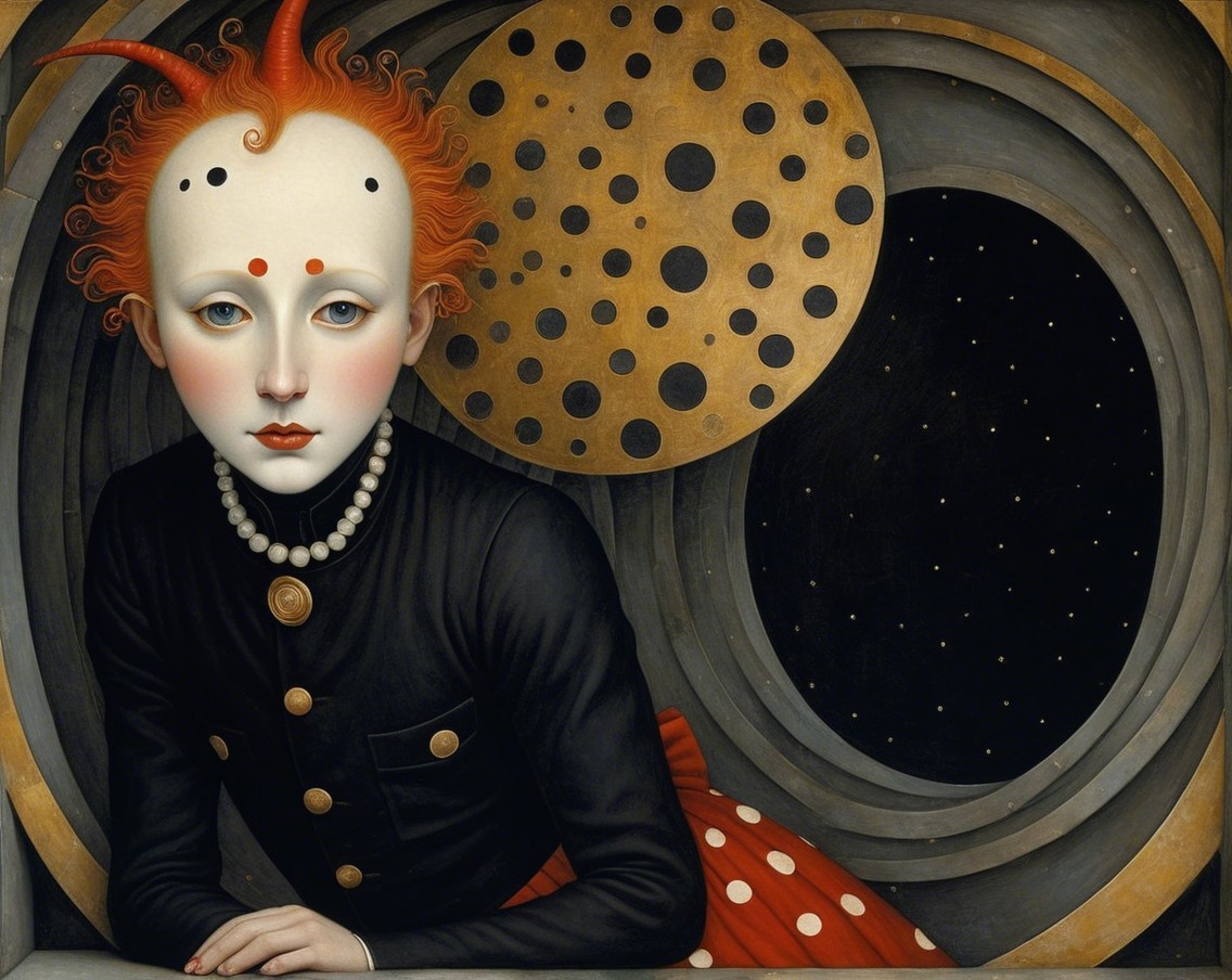 The artwork features a pale, introspective figure with wild red hair, sitting beside a small rabbit in a red coat. They are surrounded by a whirl of polka dots and a golden balloon.