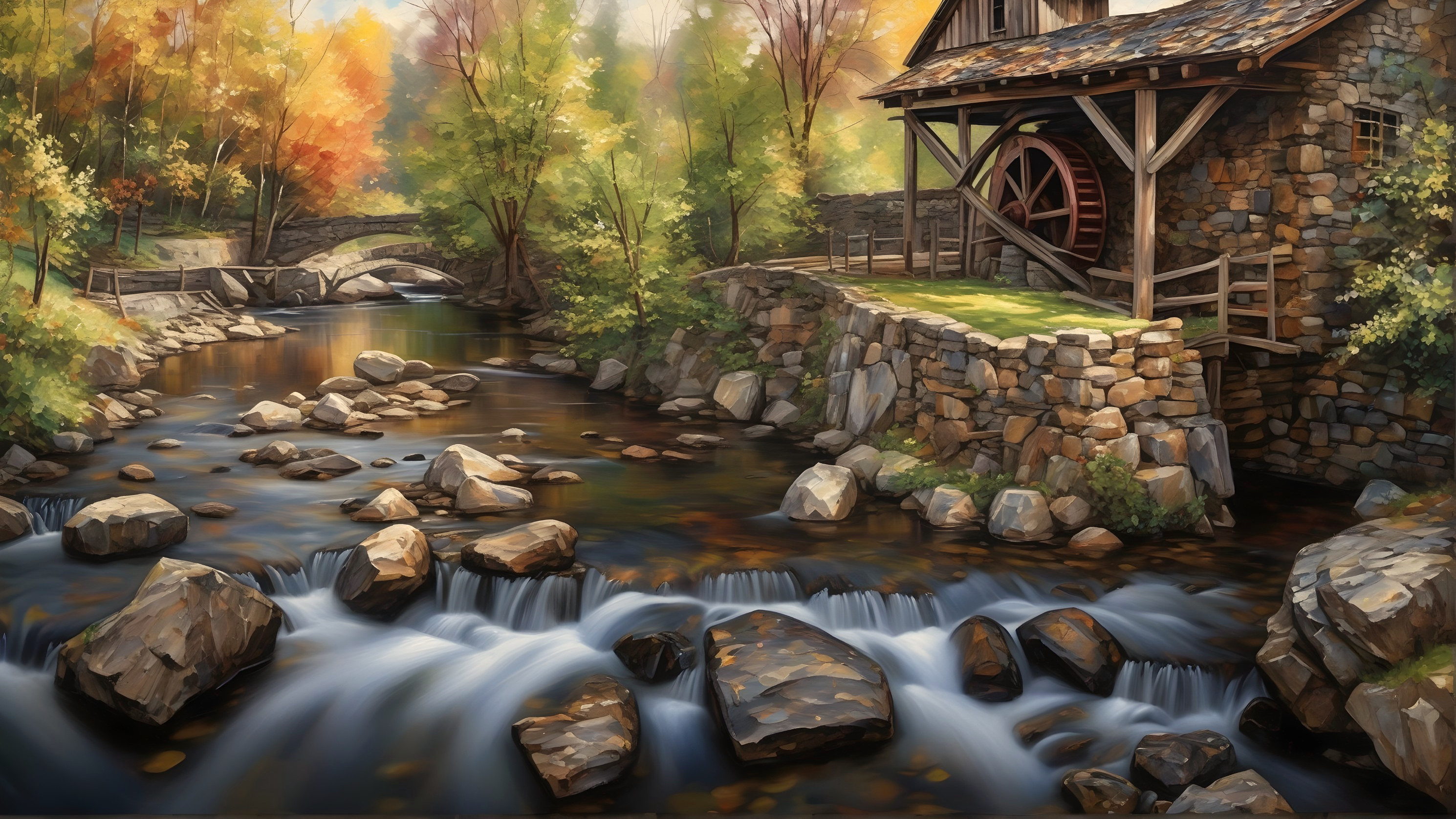 A serene autumn scene with an old watermill beside a stream, surrounded by trees with colorful foliage, and a stone bridge in the background.