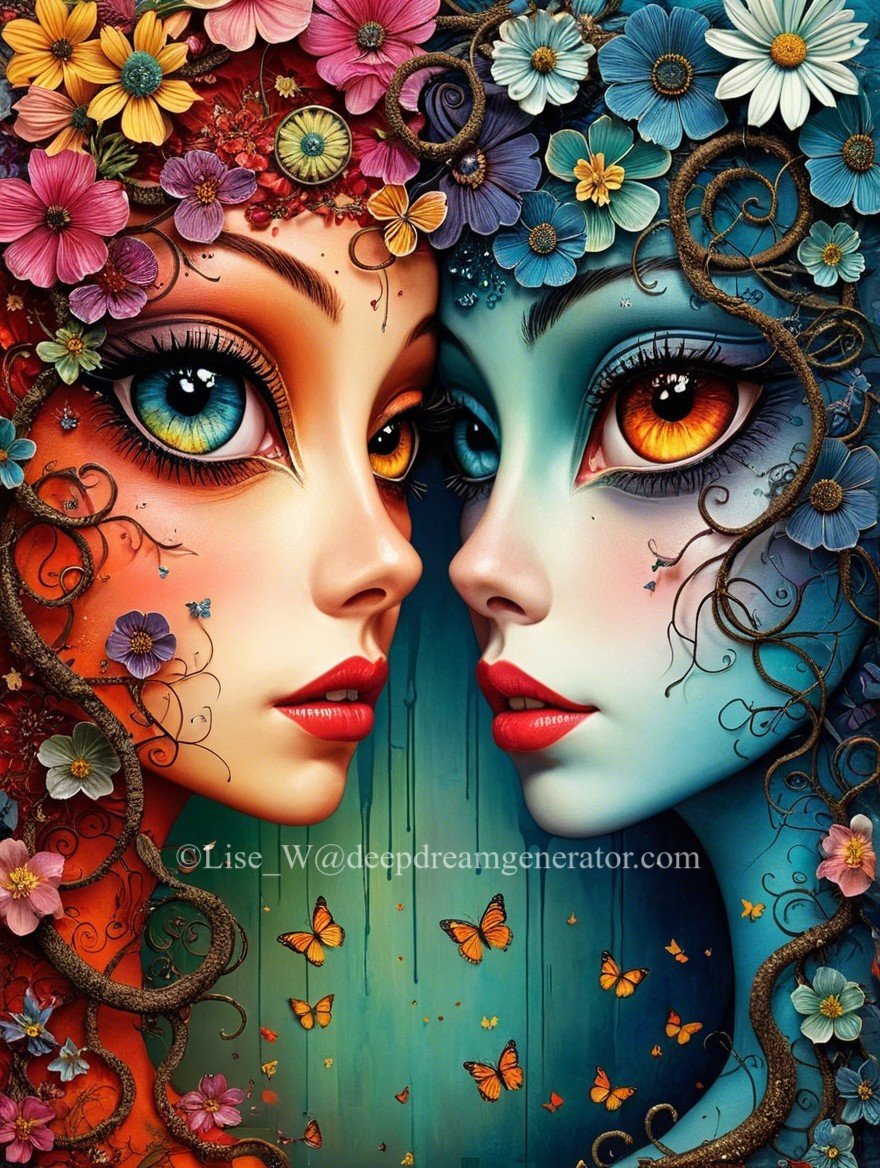 The image features two beautifully illustrated faces side by side, adorned with vibrant flowers and intricate vines, symbolizing duality and nature's harmony, with butterflies fluttering around.