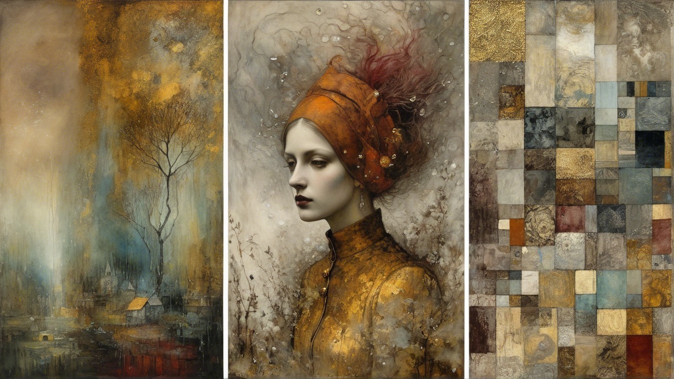 A triptych featuring a surreal landscape with a golden moon, a portrait of a woman in amber attire and a vibrant headscarf, and an abstract geometric design of earthy colors.
