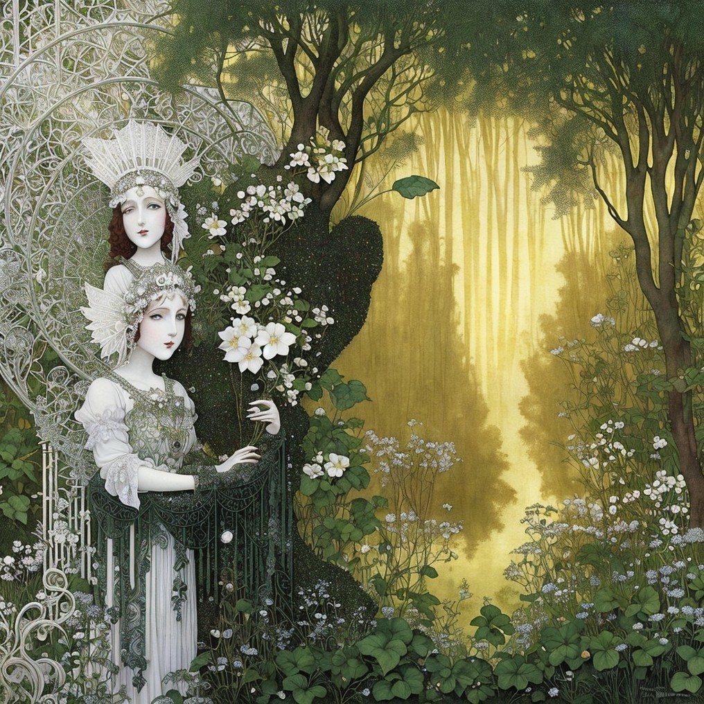 A serene, ethereal figure stands amidst intricate foliage, holding a delicate flower. Behind her, a mystical landscape of towering spires fades into soft gold hues, evoking a dreamlike atmosphere.