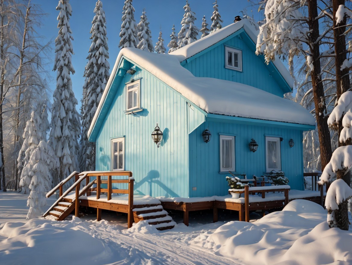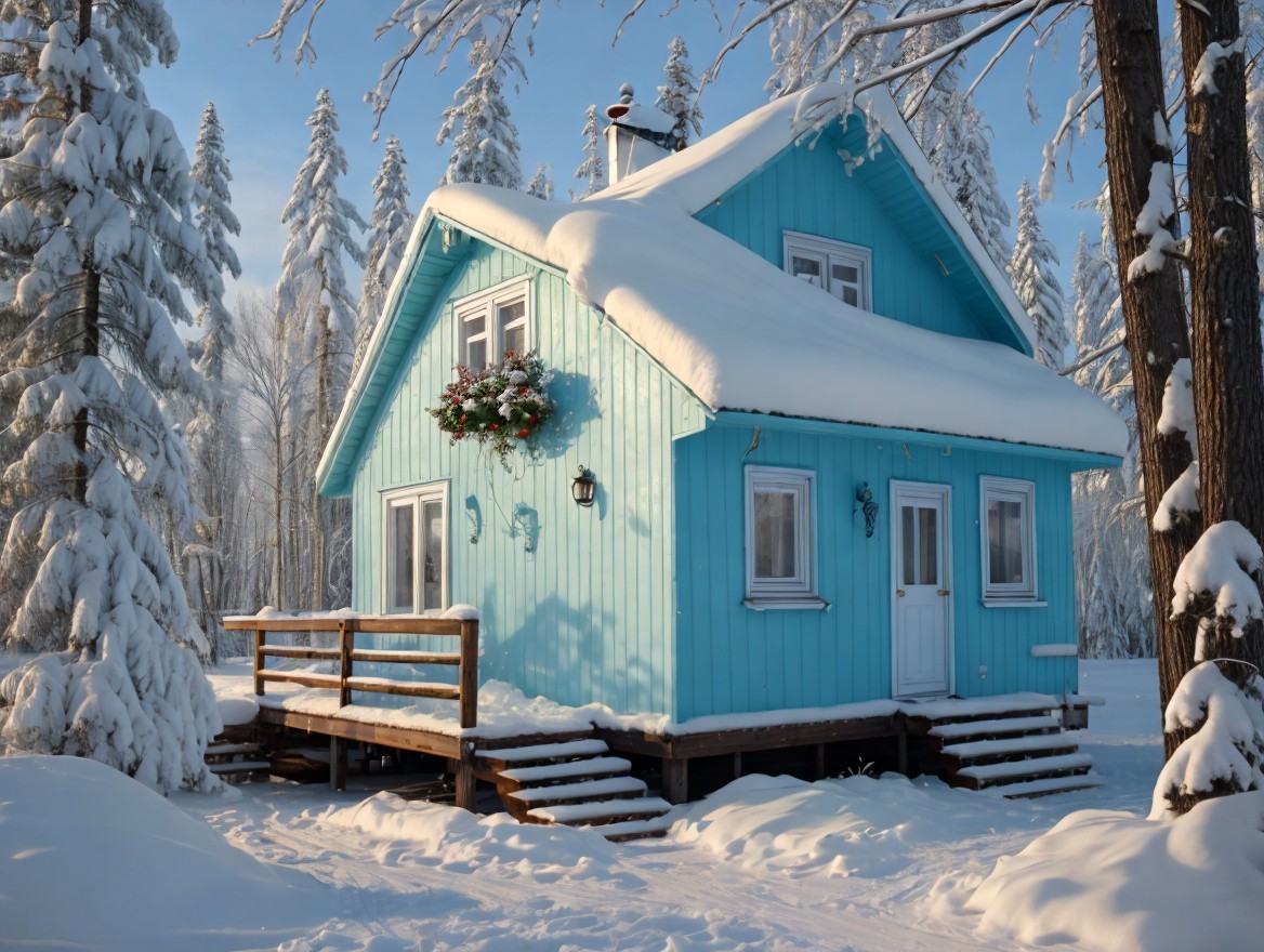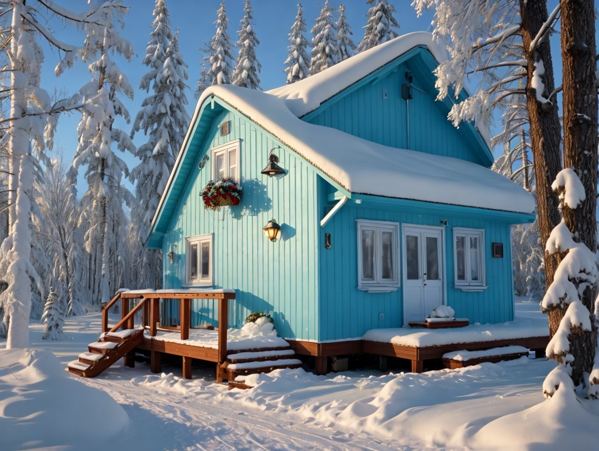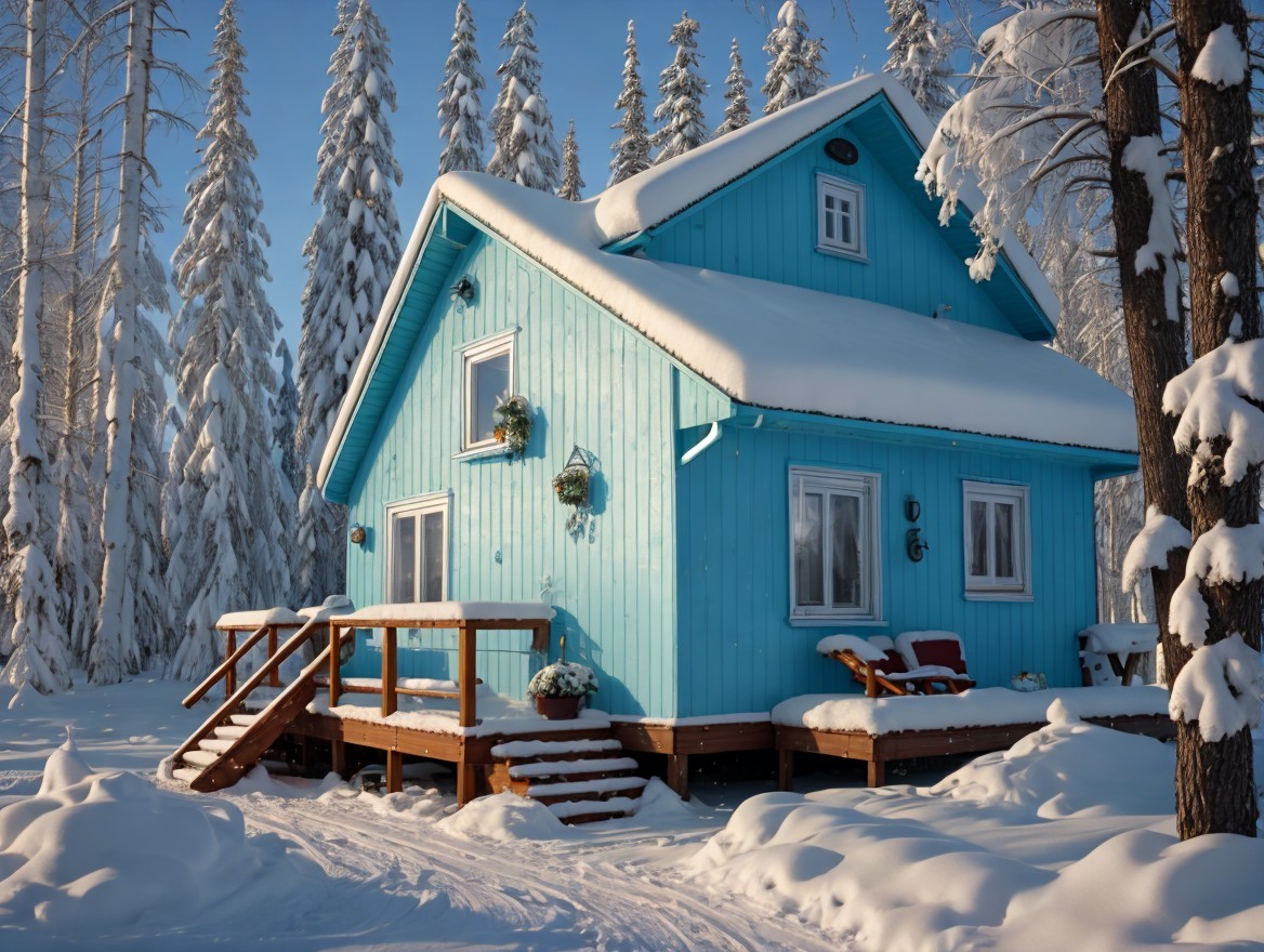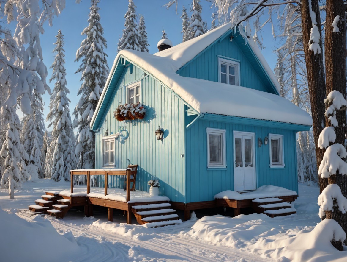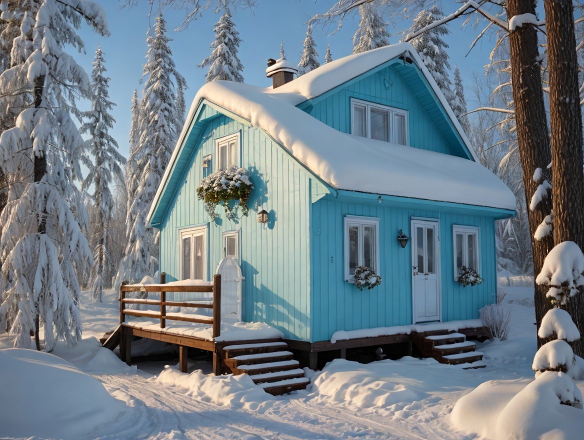 A charming blue house adorned with snow sits amidst tall trees, its roof heavy with white snow. Sunlight casts a warm glow, creating a cozy winter atmosphere in a serene landscape.