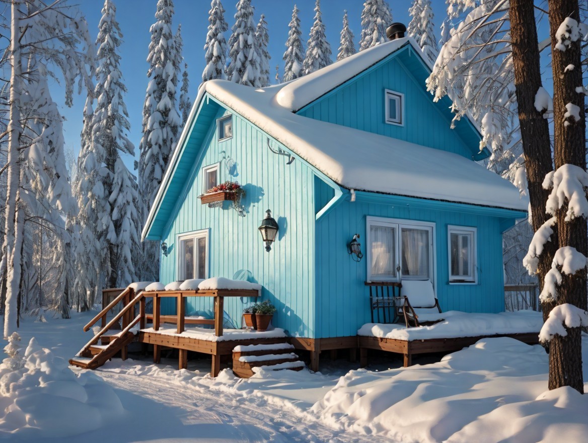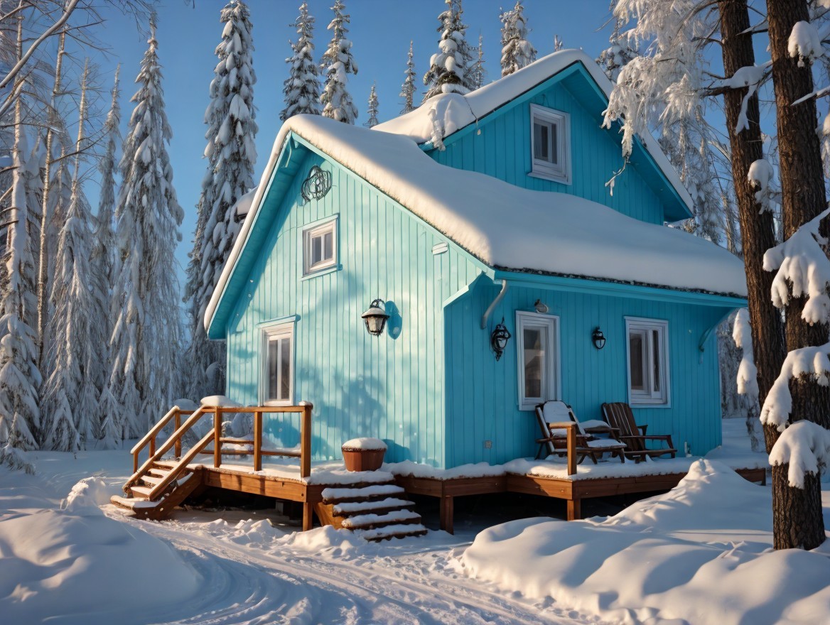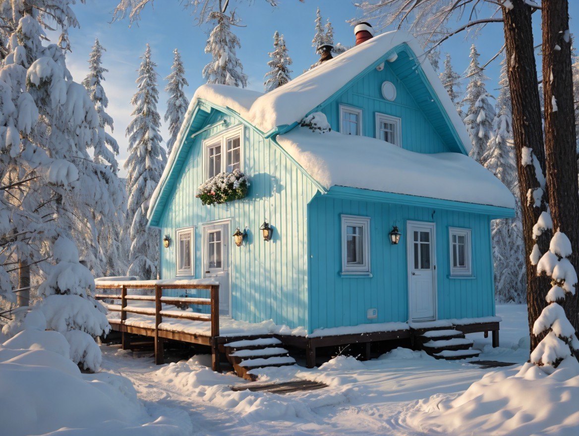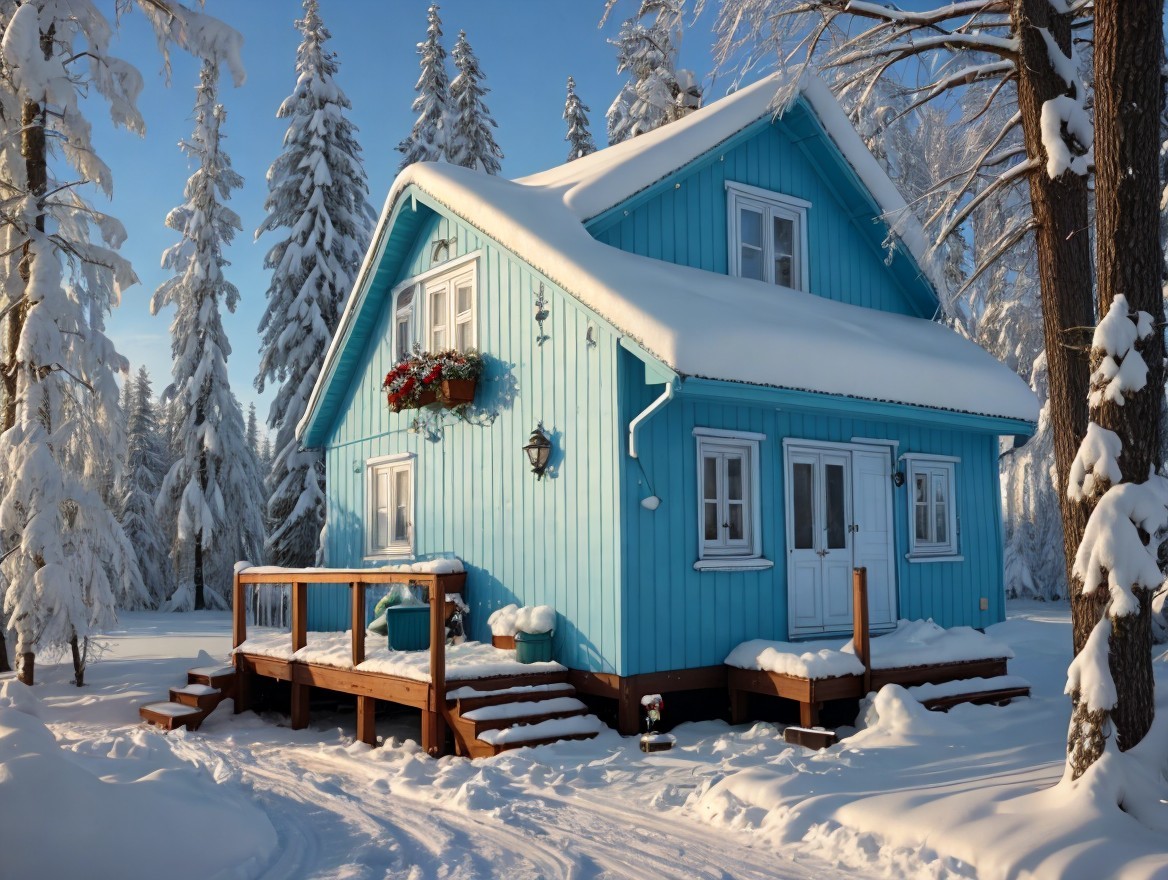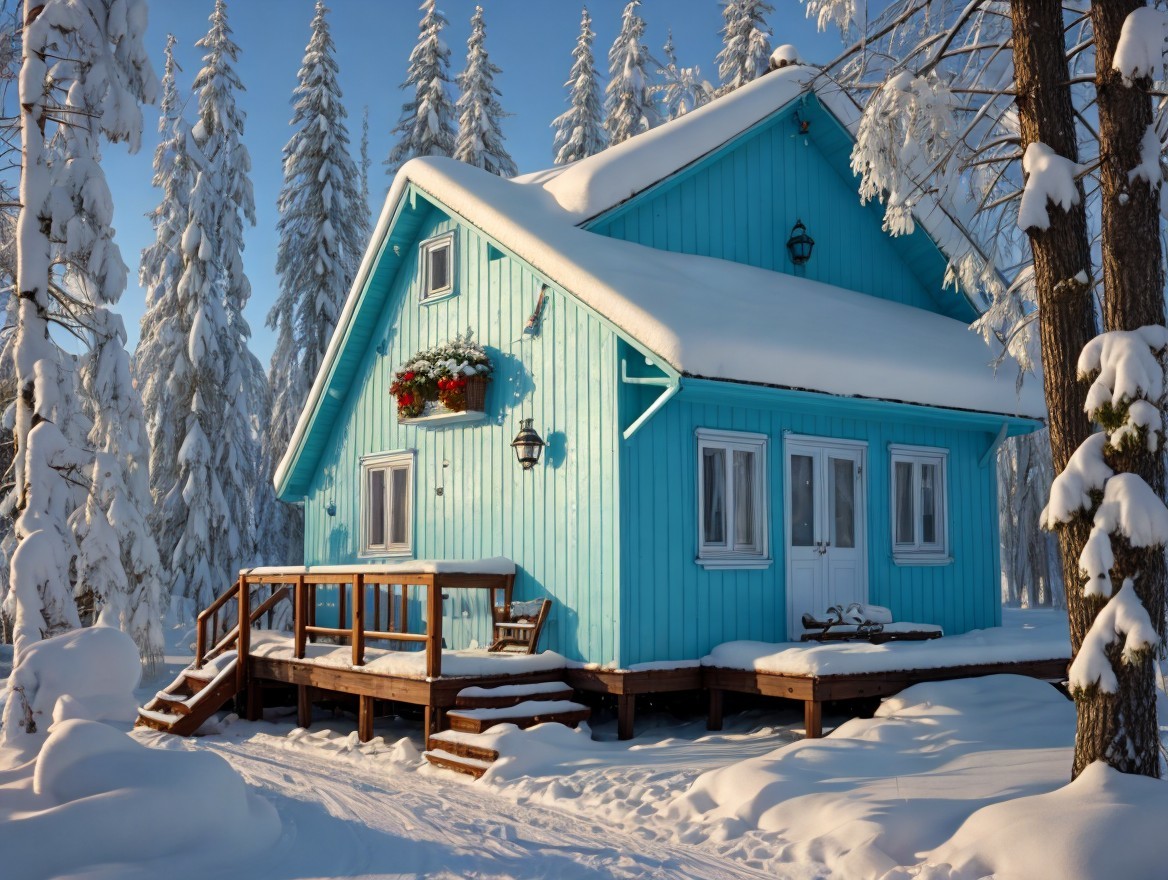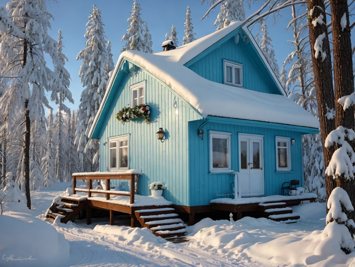 A charming blue house adorned with snow sits amidst tall trees, its roof heavy with white snow. Sunlight casts a warm glow, creating a cozy winter atmosphere in a serene landscape.