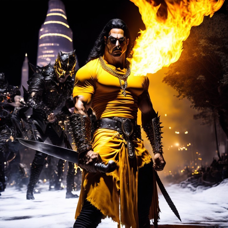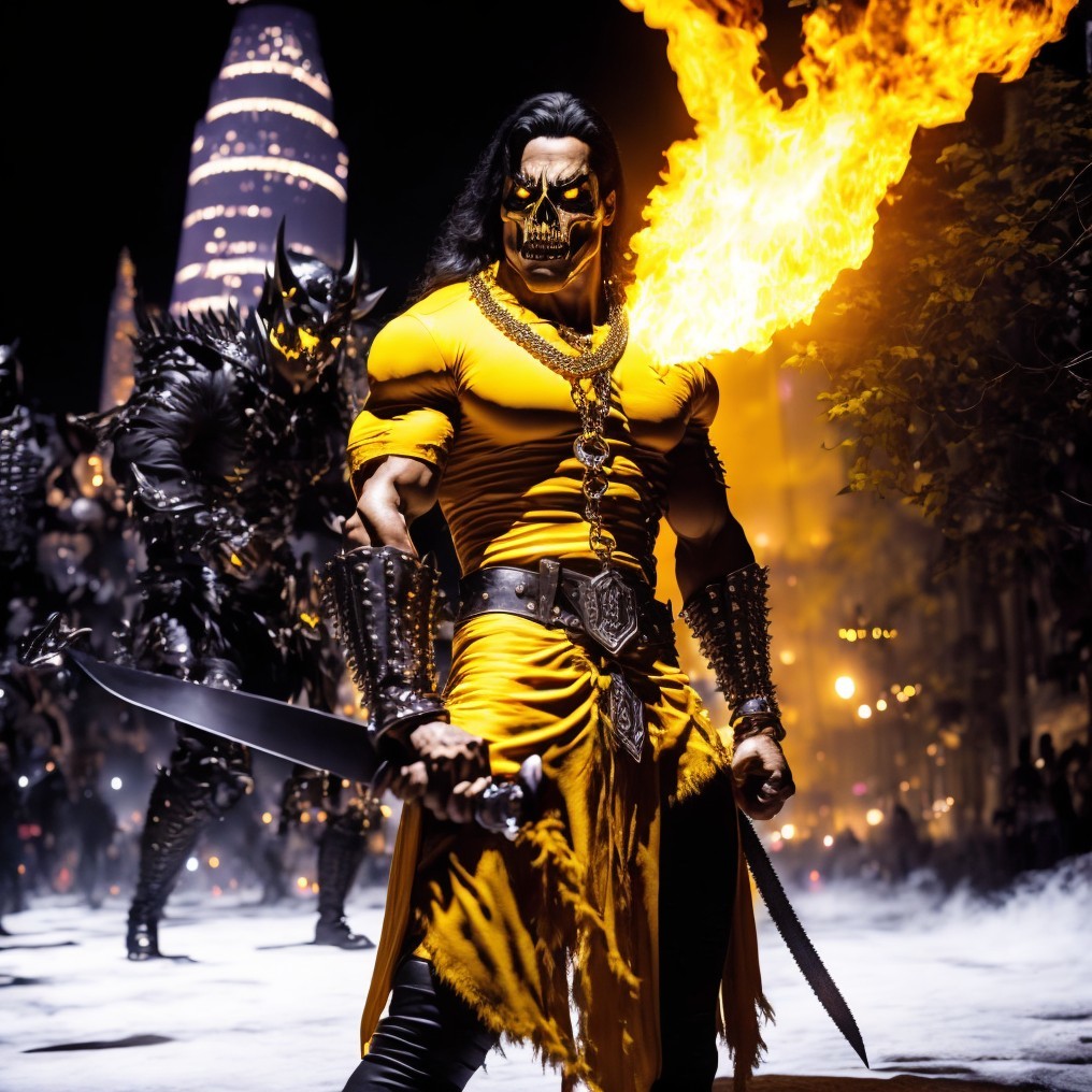 A menacing warrior in elaborate armor breathes fire at night, leading a group of similarly dressed figures with a cityscape in the background.