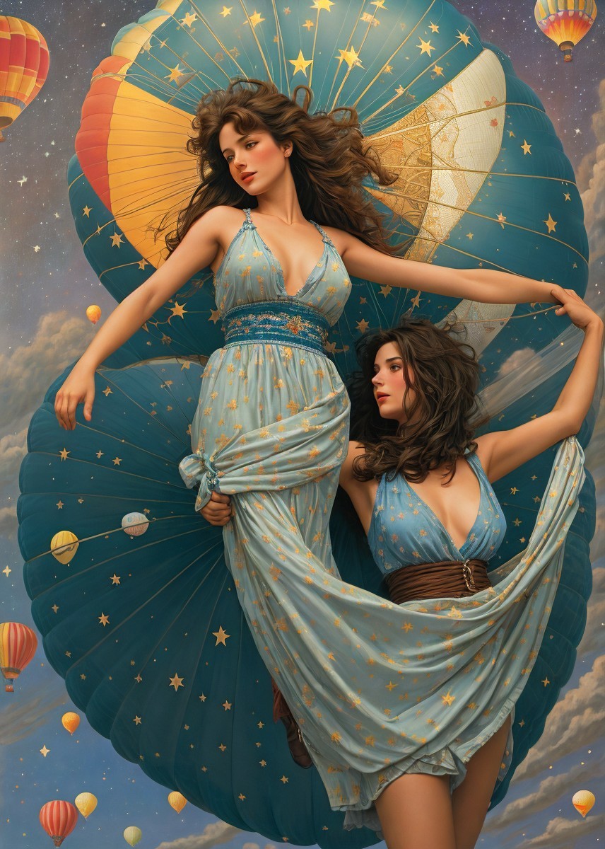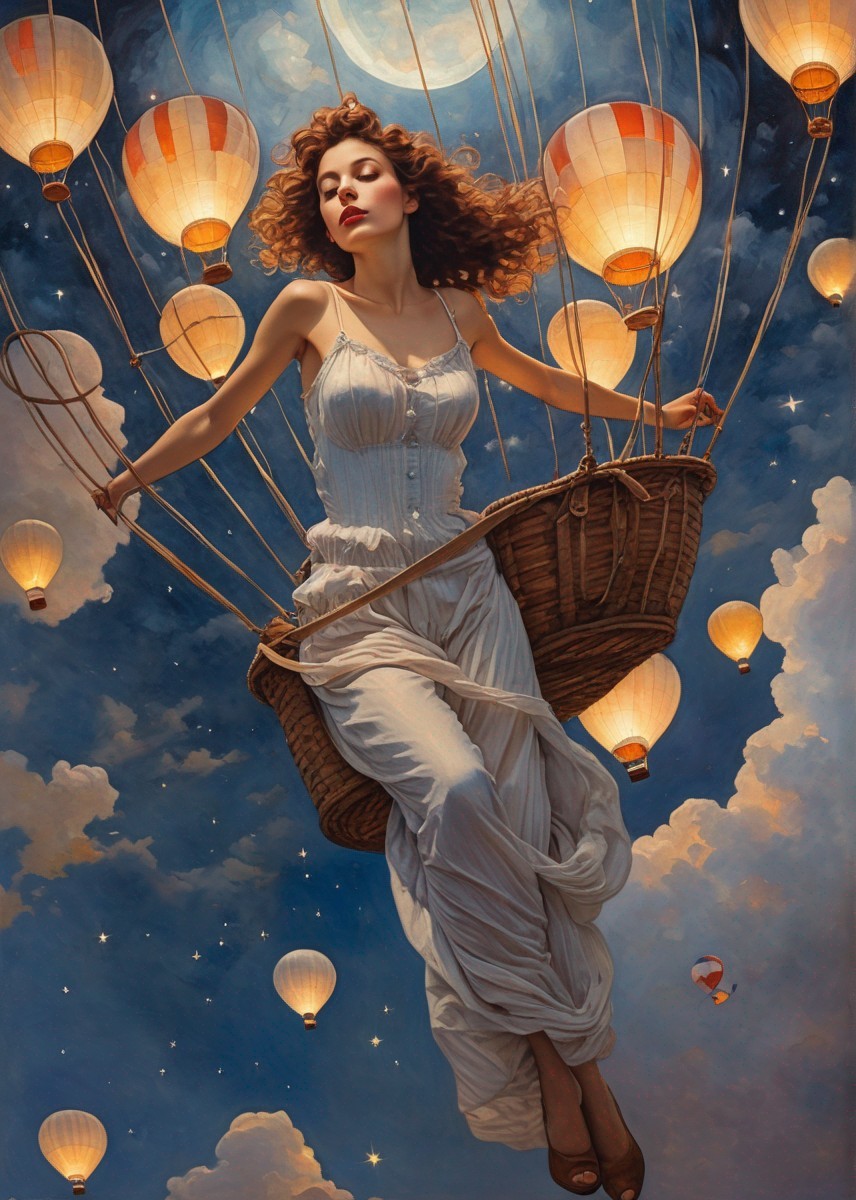 A serene artwork of people in a hot air balloon basket, with other balloons aloft in a dusk sky dotted with stars.