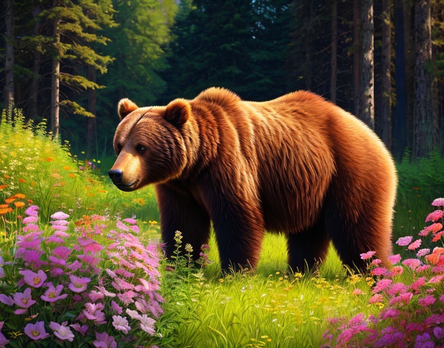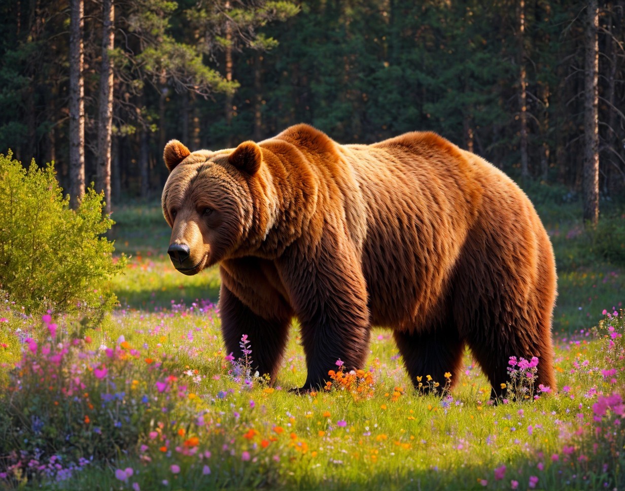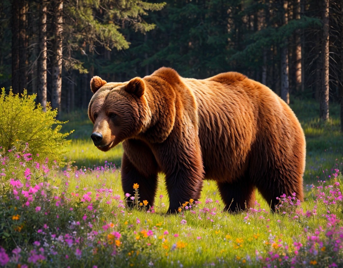 Prompt: Create an image of a large, majestic brown bear with a glossy, thick fur coat that glimmers in hues of amber and chocolate. The bear is standing in a vibrant, sunlit meadow filled with lush green grass and an assortment of wildflowers, including prominent pink and orange blossoms. In the background, there is a dense forest with tall, slender pine trees reaching into a clear blue sky lightly brushed with soft white clouds. The lighting suggests early morning with the sun casting a warm glow that enhances the saturation and vivid colors of the scene. The bear's expression is tranquil and contemplative as it gazes into the distance, embodying the serene essence of the wilderness.