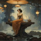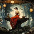 A serene scene features a woman in a flowing red dress seated on a stone fountain, surrounded by lush greenery and glowing lanterns in an enchanting courtyard. Soft light enhances the magical atmosphere.