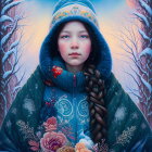 A young woman with a long braid stands in a snowy landscape, holding a bouquet of flowers. She wears a blue cloak and a decorated hat, against a serene background with a glowing moon.