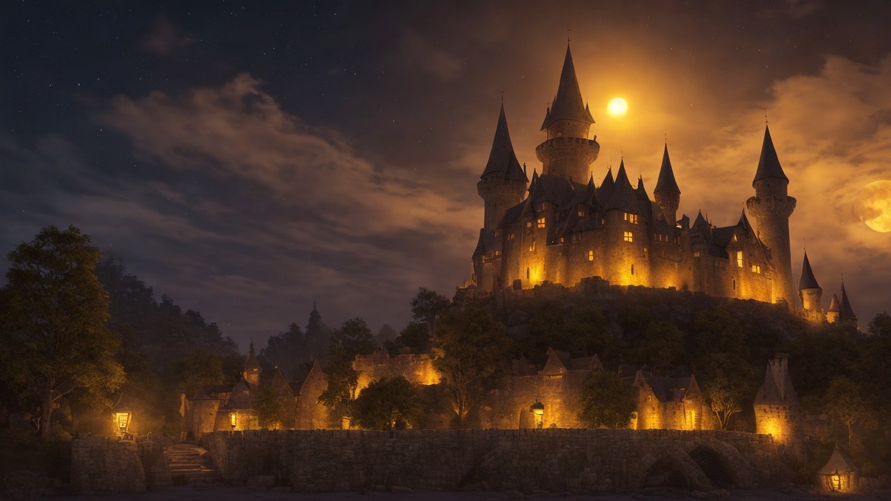 A majestic castle sits atop a rocky hill, illuminated by warm lights against a twilight sky. Two moons shine above, adding a mystical aura to the enchanting landscape. Stars twinkle in the background.