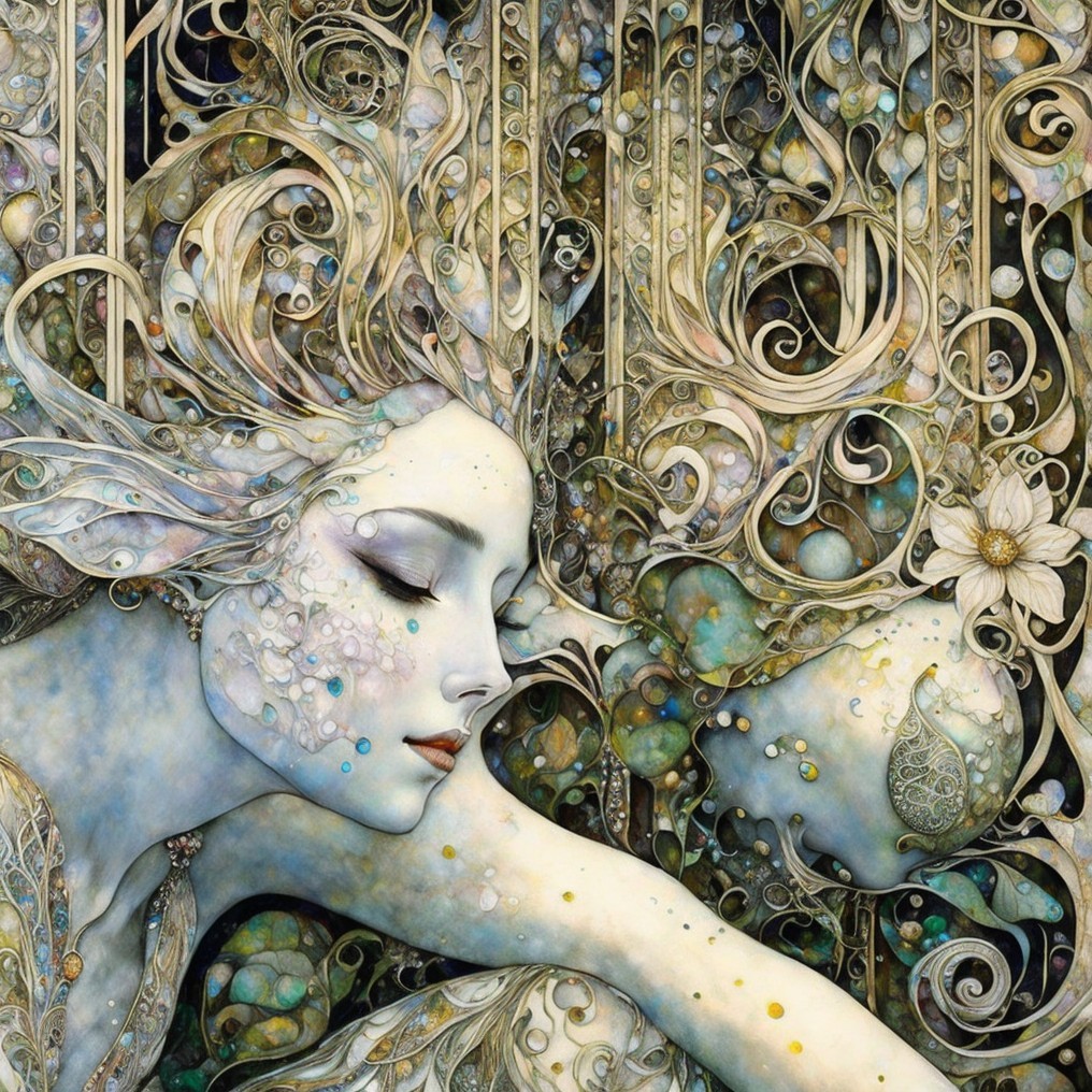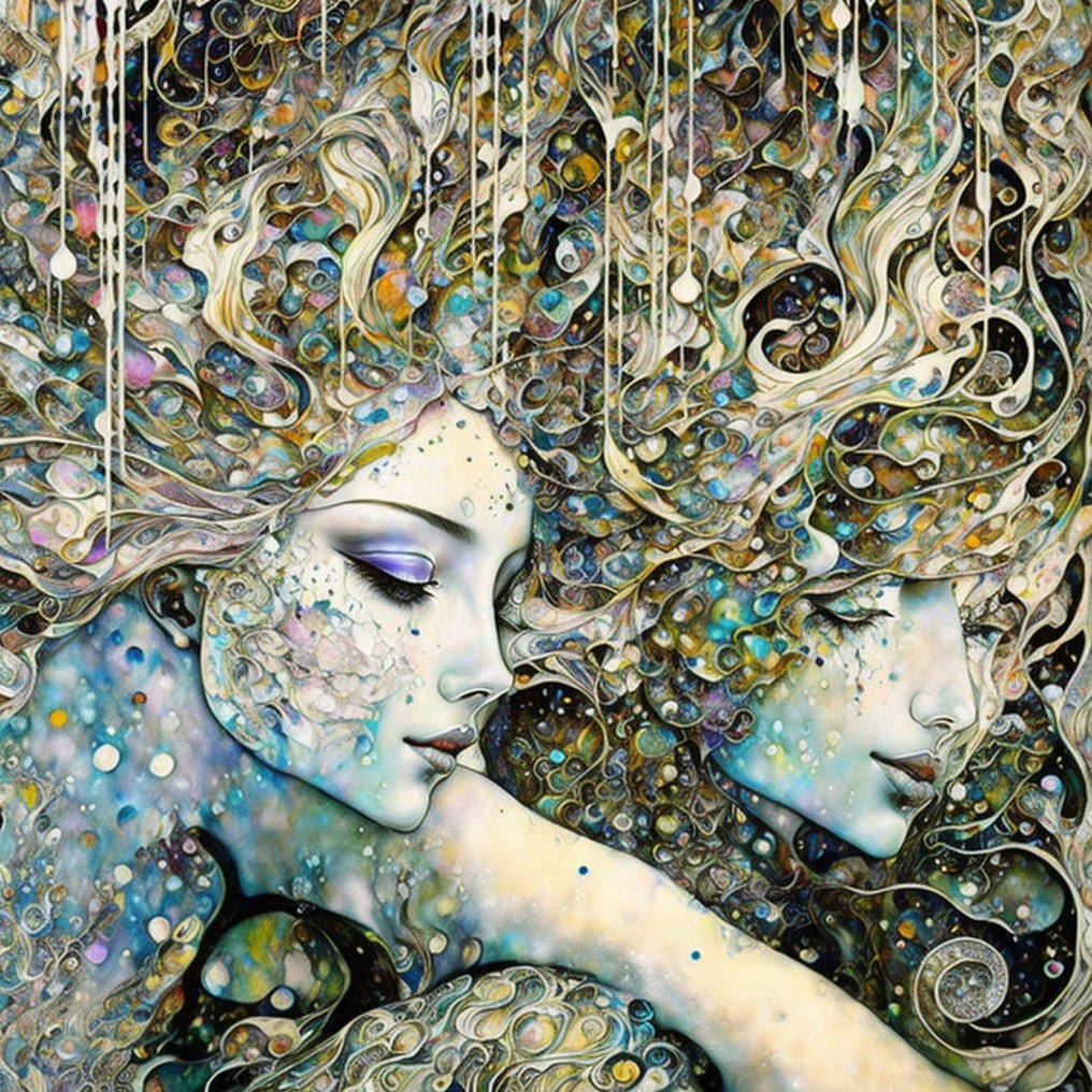 The artwork features two ethereal women with flowing hair, intertwined with vibrant colors and abstract patterns, evoking a sense of connection and introspection against a dark background.