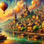A vibrant sunset casts warm hues over a picturesque lakeside village, with charming colorful houses and hot air balloons soaring above, creating a serene and idyllic atmosphere.